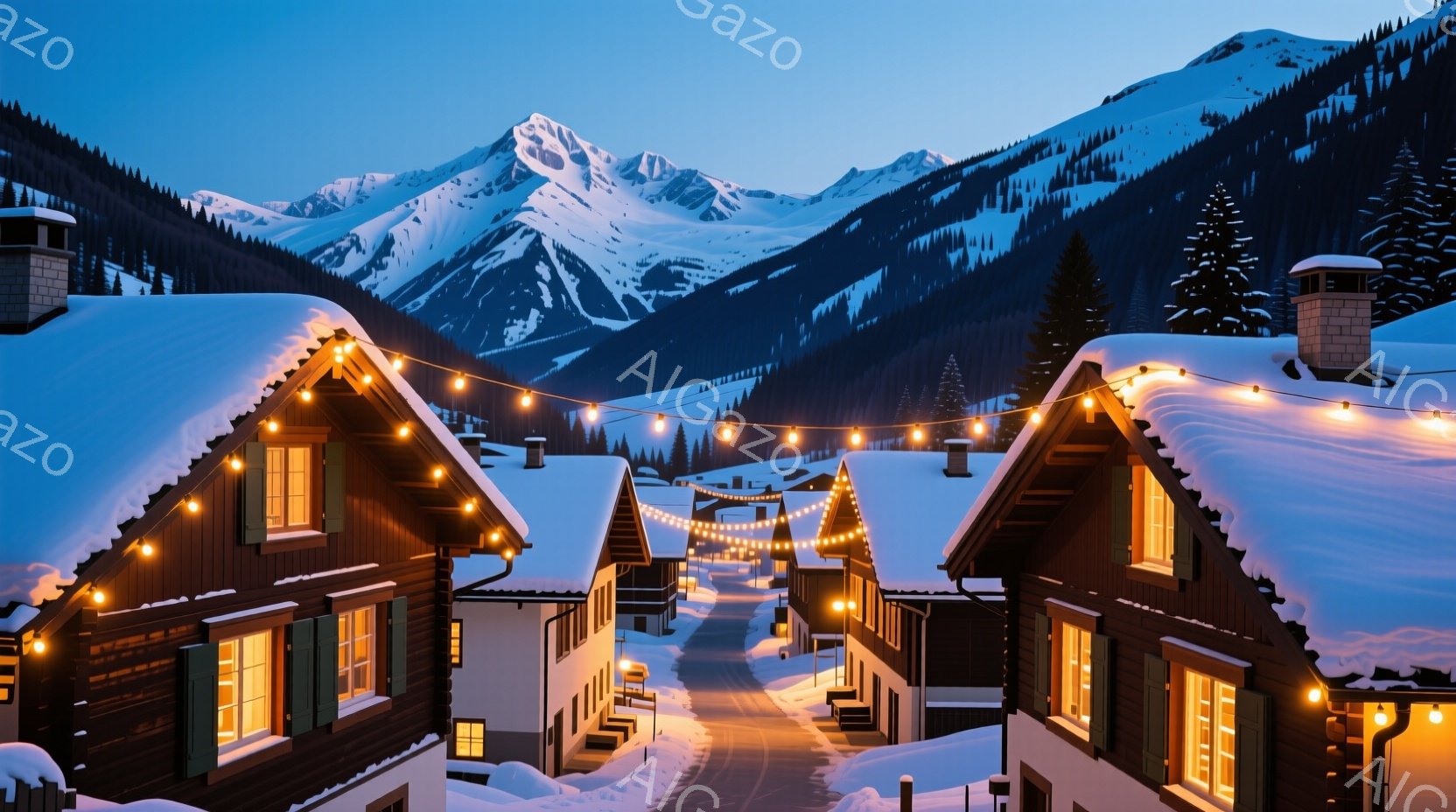 雪深い山々に囲まれた、可愛らしい山小屋が連なる風景です。小屋の屋根には雪が積もり、窓からは温かい光が漏れ、クリスマスのイルミネーションが灯りを添えています。背景には、雪をまとった雄大な山々が連なり、静かで幻想的な冬の雰囲気を醸し出しています。