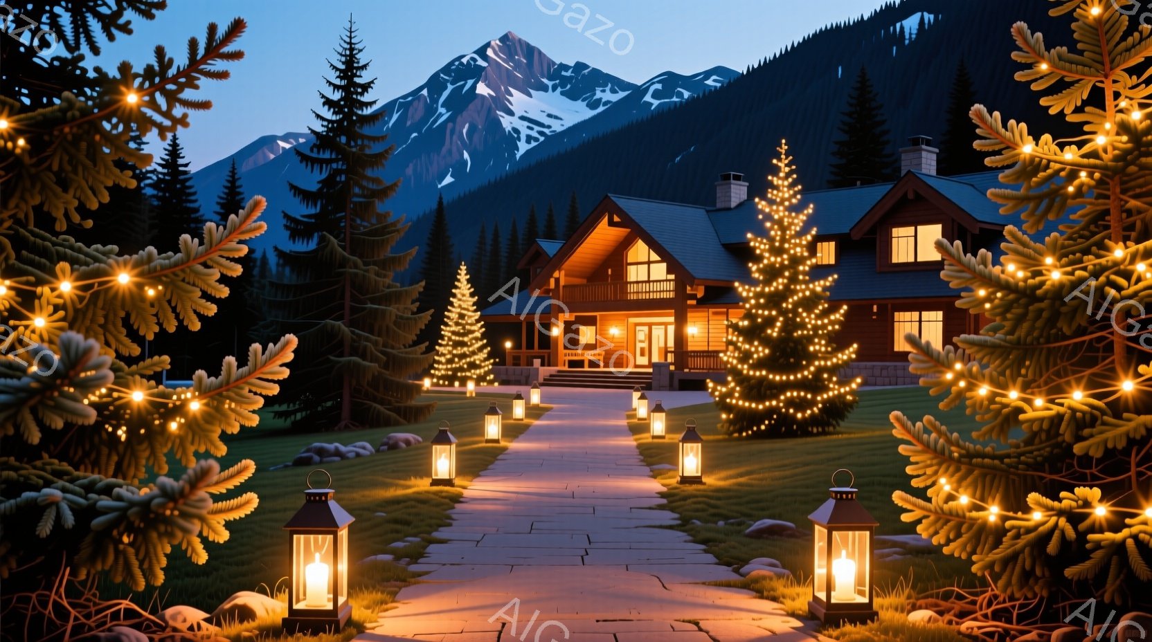雪をかぶった山々を背景に、ライトアップされたクリスマスツリーとランタンが並ぶ遊歩道が、暖かく明るい邸宅へと続いています。邸宅からは暖かい光が漏れ出し、冬の夜の穏やかな雰囲気を醸し出しています。緑豊かな芝生と雪景色が、静かでリラックスした空間を作り出しています。