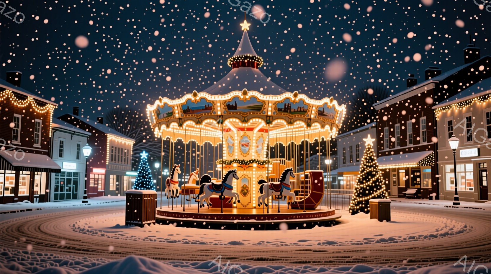 雪が降り積もる夜の街の中心に、イルミネーションで輝くメリーゴーランドが描かれています。建物はレンガ造りで、窓からは暖かな光が漏れ、クリスマスの飾り付けが施された大きなクリスマスツリーがメリーゴーランドの横に立っています。全体的に、静かで温かいクリスマスの夜の雰囲気が漂っています。