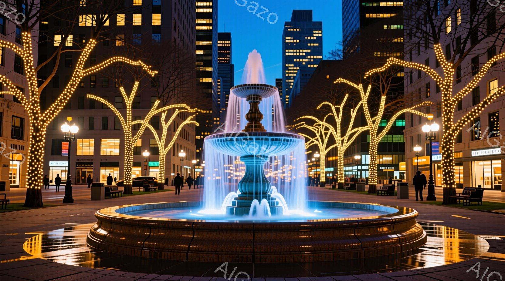 噴水は青白い光を放ち、クリスマスの飾り付けで華やかに彩られています。背景には高層ビル群が立ち並び、夜空にその姿を現しており、クリスマスのイルミネーションで飾られた木々が、場を温かく包み込んでいます。人々は冬の装いで噴水周りを散策し、穏やかで祝祭的な雰囲気を醸し出しています。