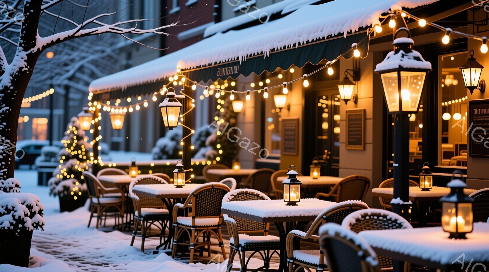 雪が降り積もった冬のカフェのテラス席が描かれています。テーブルや椅子は雪で覆われ、暖色のランタンとイルミネーションが幻想的な雰囲気を醸し出しています。背景には雪で覆われた建物が見え、静かで穏やかな冬の風景が広がっています。