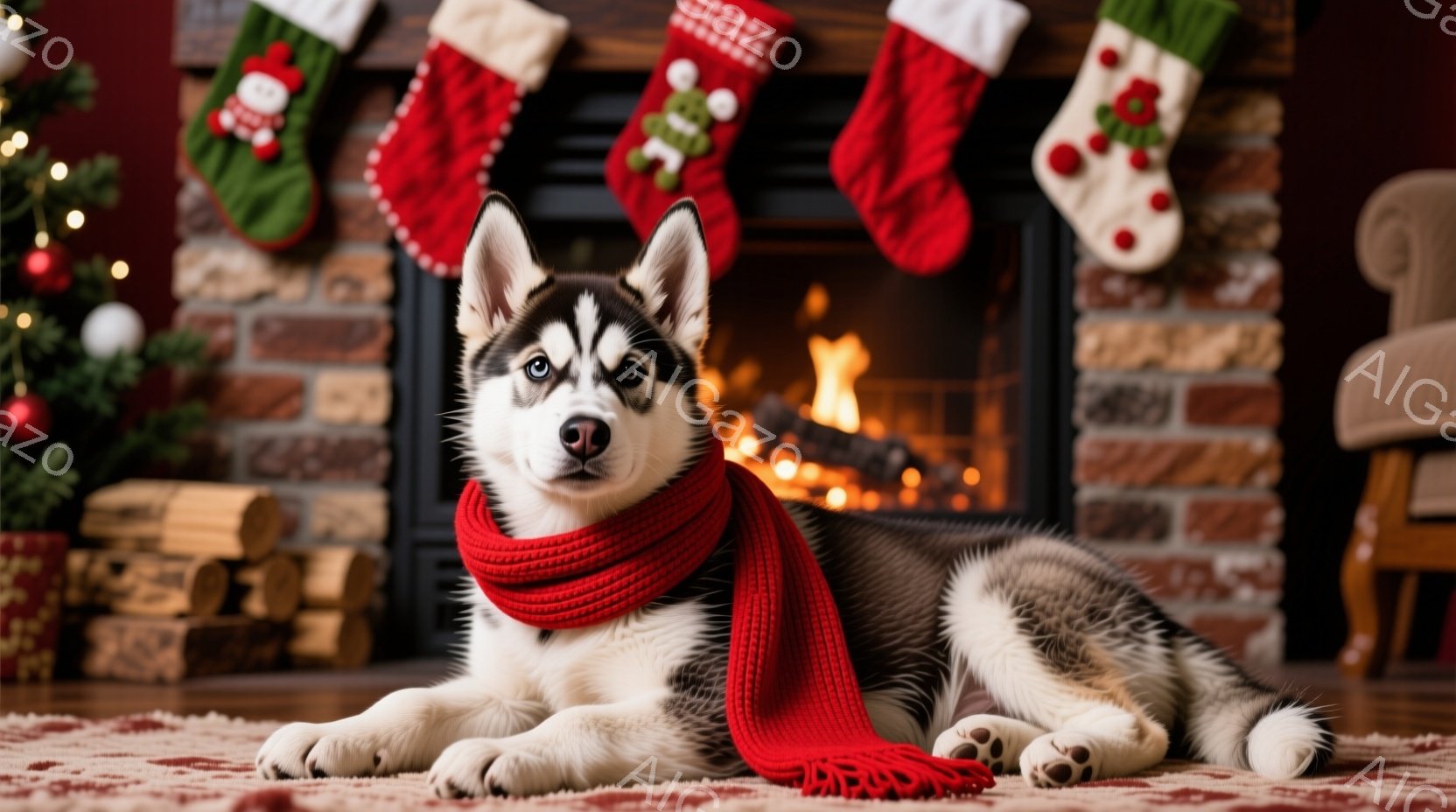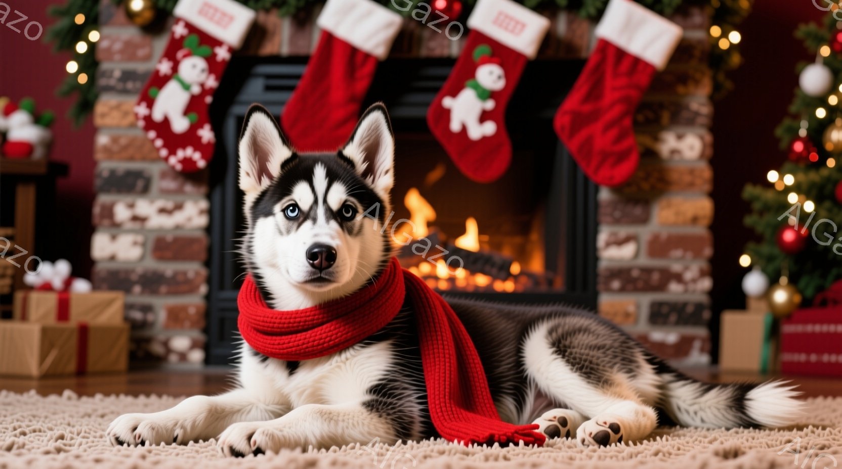 白黒のハスキーの子犬が、赤いマフラーを巻いて赤い絨毯の上に横たわっています。背景には暖炉があり、火が燃え、クリスマスソックスとプレゼントが並んでいます。全体的に温かく、お祝いの雰囲気が漂っています。