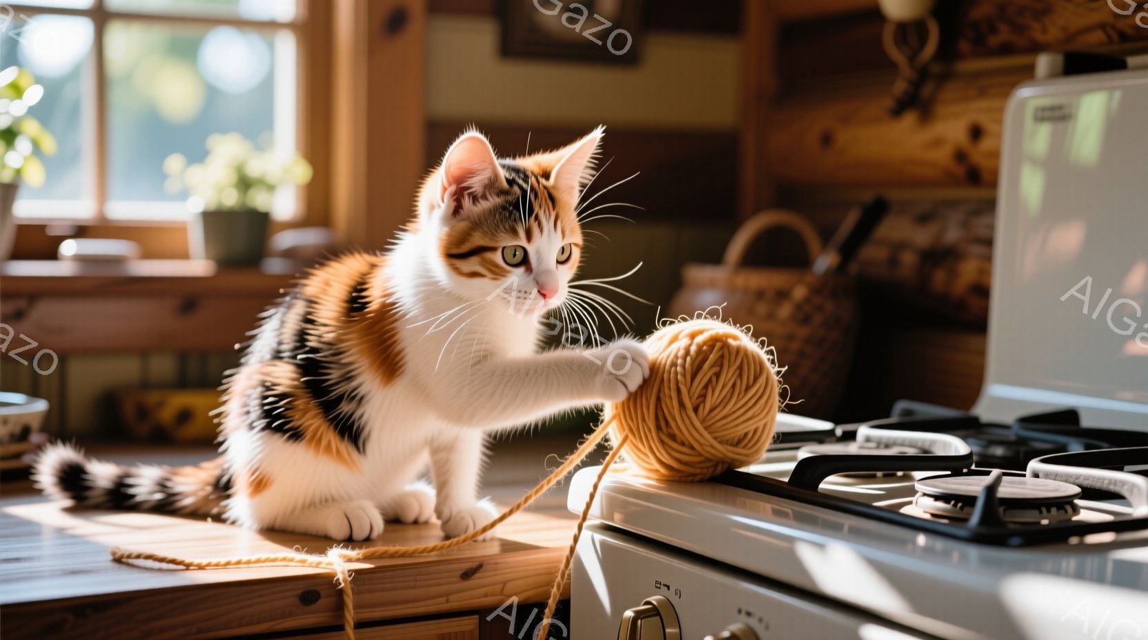 白と黒と茶色の縞模様の猫がキッチンカウンターの上に座り、オレンジ色の毛糸玉を前足で叩いている。背景には木製のキャビネットと窓が見え、室内は暖かく明るい雰囲気で、猫がリラックスして遊んでいる様子が伺える。毛糸玉と猫の遊ぶ姿が、温かさと可愛らしさを感じさせる一枚である。