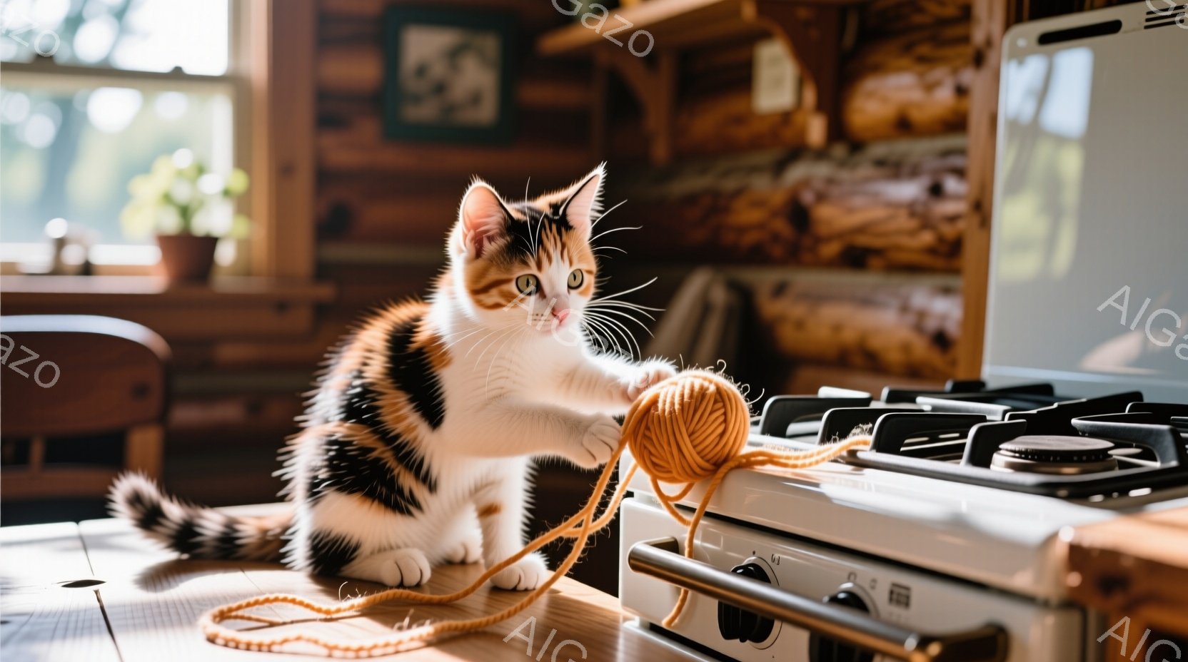 白と茶色のまだら模様の猫がキッチンカウンターの上に座り、遊び心いっぱいの表情で麻ひも玉を前足で叩いています。背景には木製のキャビネットや緑豊かな自然が見え、温かく居心地の良い家庭的な雰囲気が漂っています。光が差し込み、猫の毛並みを明るく照らし出しています。