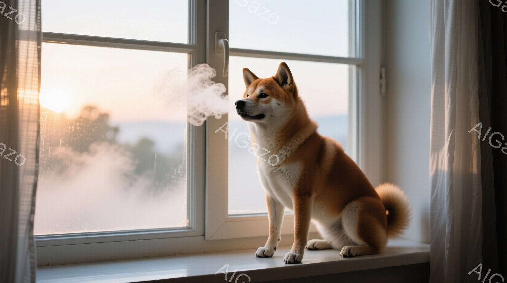 柴犬が窓辺に座り、息を吐いて白い蒸気を吹き出している。窓の外には夕焼けが見え、遠くの建物がシルエットとして浮かび、冬の冷たい空気と暖かな光が対照的である。犬はリラックスした表情で、穏やかで静かな雰囲気を醸し出している。