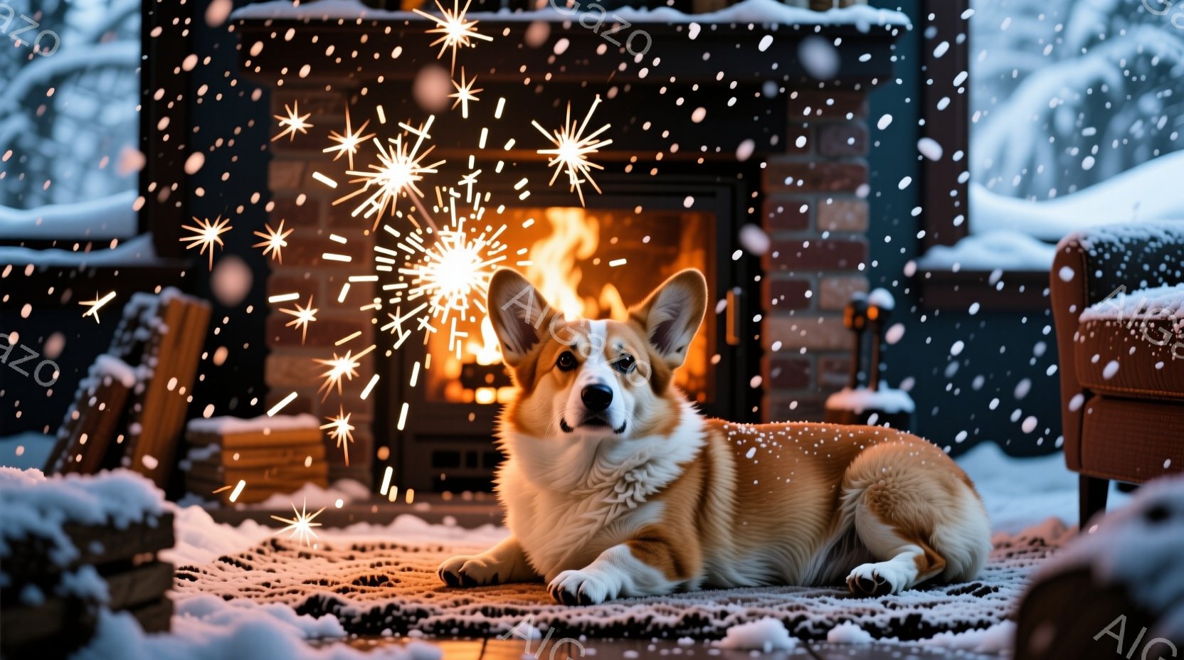 暖炉の前に横たわるコーギー犬が写っています。雪がちらつく窓の外には、雪に覆われた木々と暗い冬の風景が見えます。室内は温かく、柔らかいラグの上に犬がリラックスした様子で、全体的に穏やかで心地よい雰囲気を醸し出しています。