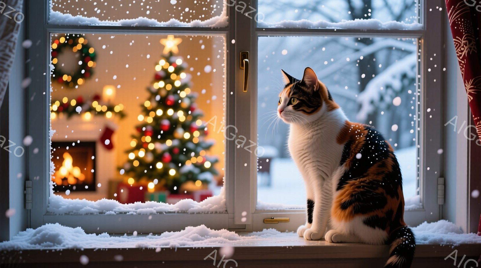 この無料AI生成画像「窓辺に二匹の猫が向かい合って座っており、互いにじっと見つめ合っています。背景にはクリスマスツリーが飾られており、窓の外は雪景色で、暖かく穏やかな冬の雰囲気が漂っています。窓枠には雪が積もり、部屋のカーテンは白く、優雅な雰囲気を添えています。」は、2025年10月22日に作成されました。 サイズは 1664×928px の高解像度で、商用利用も可能なフリー素材として提供しています。