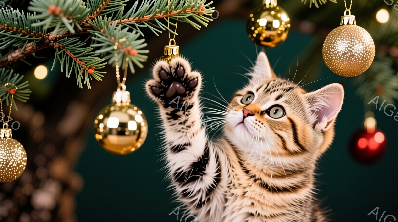 茶トラの小さな子猫がクリスマスツリーの枝に手を伸ばし、キラキラと輝くオーナメントに興味津々な表情をしています。背景にはぼやけた緑色の葉と、金色と赤色の丸いオーナメントが散りばめられ、温かく楽しいクリスマスの雰囲気が漂っています。子猫の毛並みは柔らかく、目は好奇心旺盛で、遊び心に満ちた瞬間が捉えられています。
