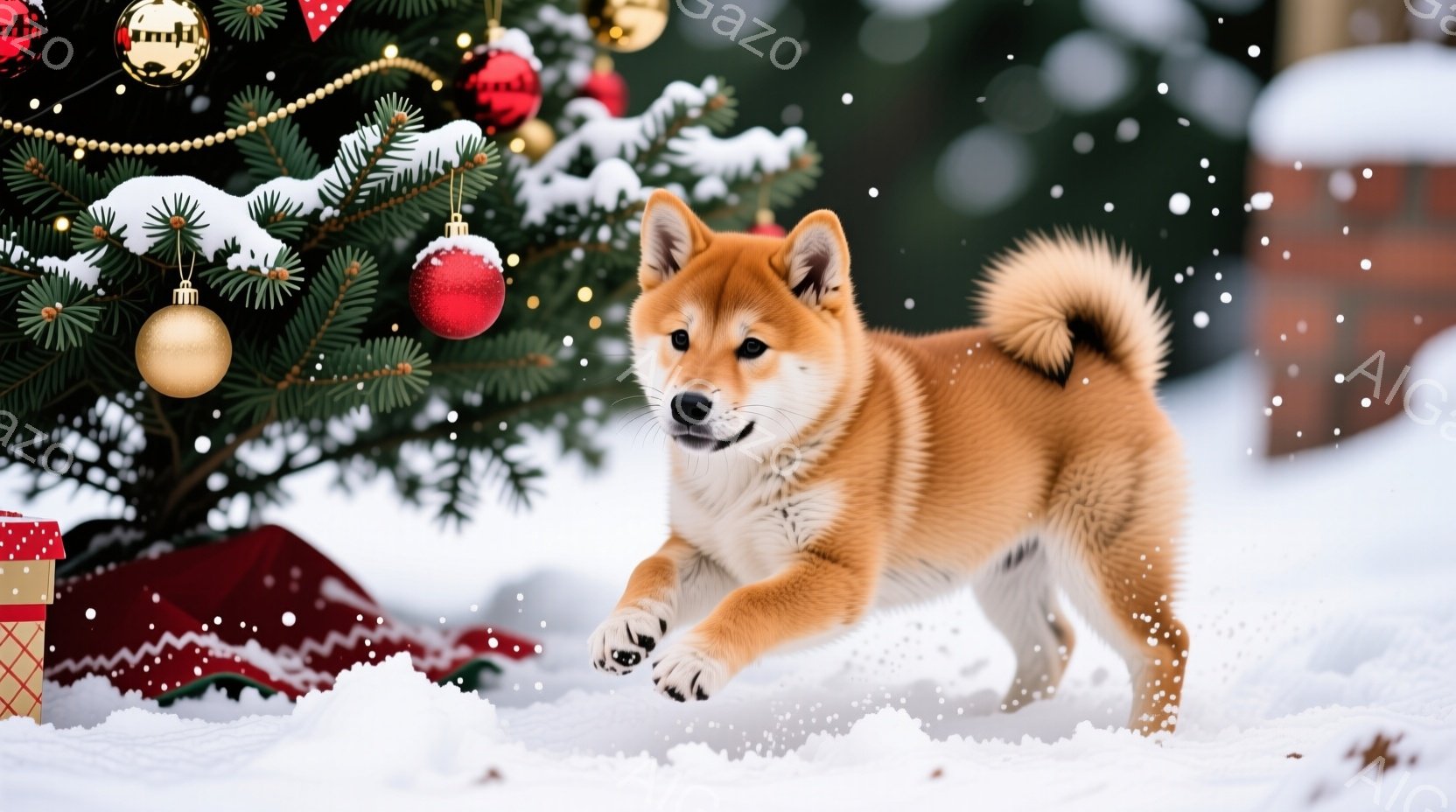 柴犬が雪の中で駆け抜けている様子が捉えられています。背景にはクリスマスツリーとプレゼントが置かれ、雪が舞う冬の情景が描かれています。犬は口を開けて楽しそうに走り、活気のあるクリスマスの雰囲気を盛り上げています。