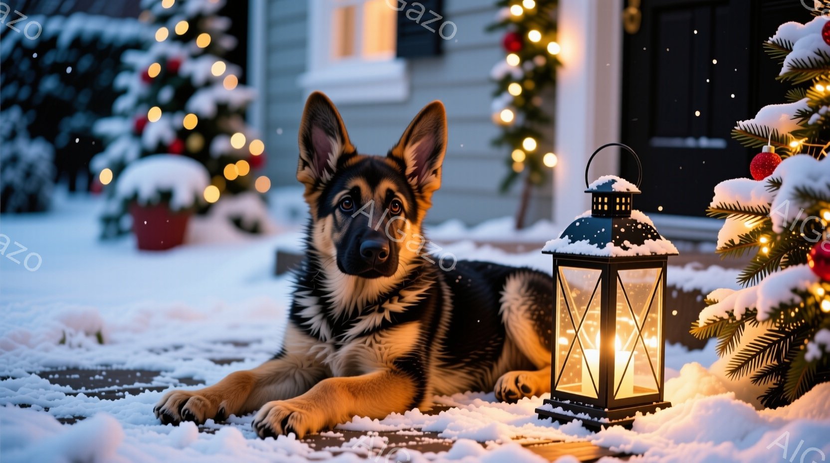 雪に覆われた家の外で、ジャーマンシェパードの子犬がリラックスして横たわっています。子犬は黒と茶色の毛並みで、落ち着いた表情で正面を見つめています。背景には、ライトで飾られたクリスマスツリーや、暖かく光るランタンが見え、冬の穏やかな雰囲気を醸し出しています。
