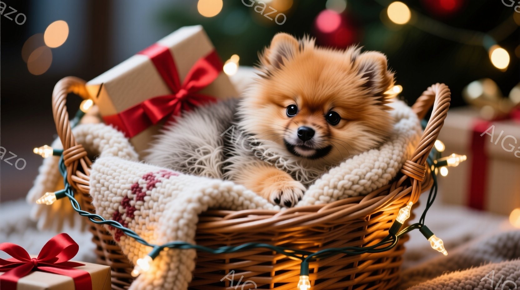 ふわふわの茶色の毛並みを持つ小型犬が、編み物のブランケットが敷かれた籐のバスケットに丸まって眠っています。周りにはキラキラと輝くクリスマスライトが飾られており、バスケットの周りには赤いリボンが付いたギフトボックスが見えます。全体的に暖かく、お祝いムードにあふれた、冬の穏やかな光景です。