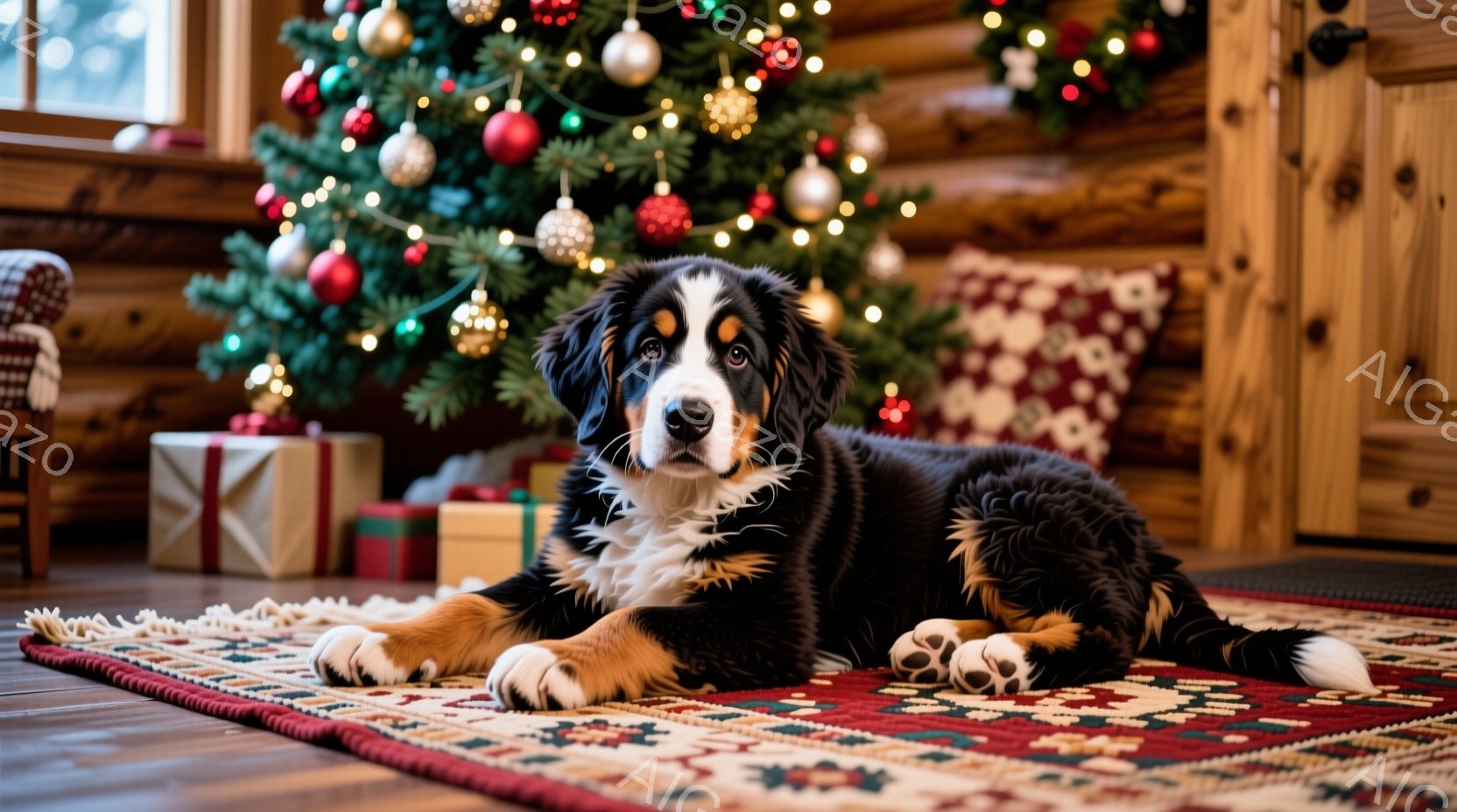 暖炉のある部屋の床に、ベルン山犬が敷かれた絨毯の上で横たわっています。犬は黒、白、茶色の毛並みで、リラックスした表情で正面を見つめています。背景にはクリスマスツリーが飾られ、プレゼントの箱やクッションが置かれ、温かくお祝いムードの室内となっています。