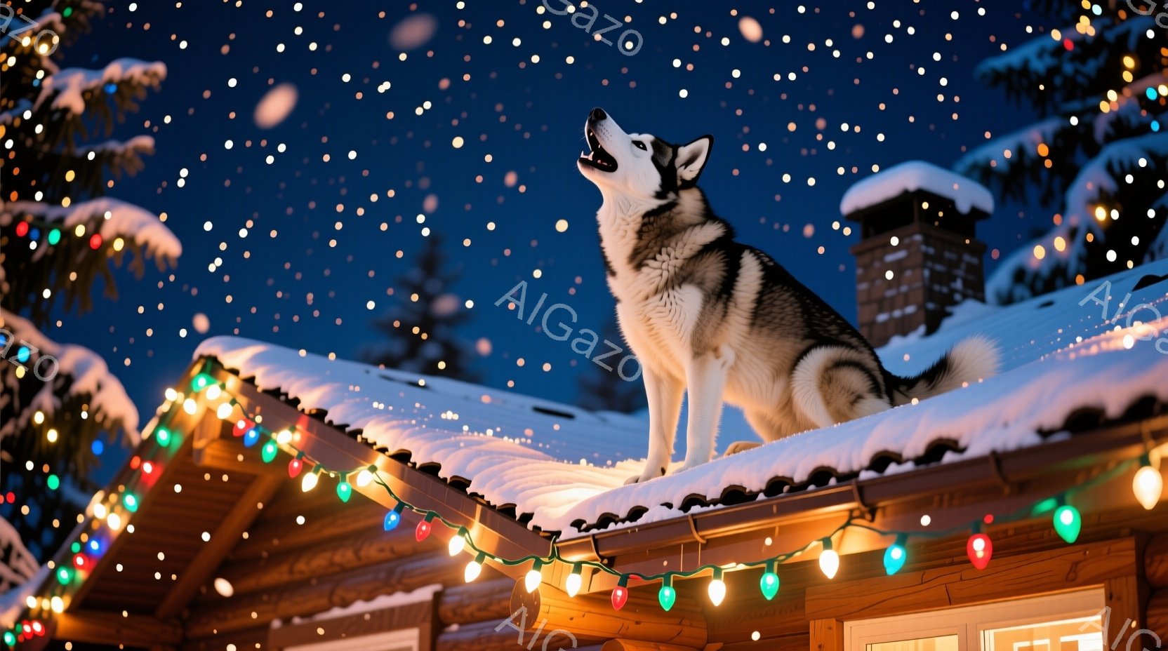 凍てつく夜空の下、雪に覆われた屋根の上で、シベリアンハスキーが遠吠えを上げている。背景には、きらびやかなクリスマスツリーが光り、雪景色の中に暖かな光を添えている。全体的に、冬の夜の静寂と、ハスキーの力強い姿が印象的な、幻想的で心温まる雰囲気である。