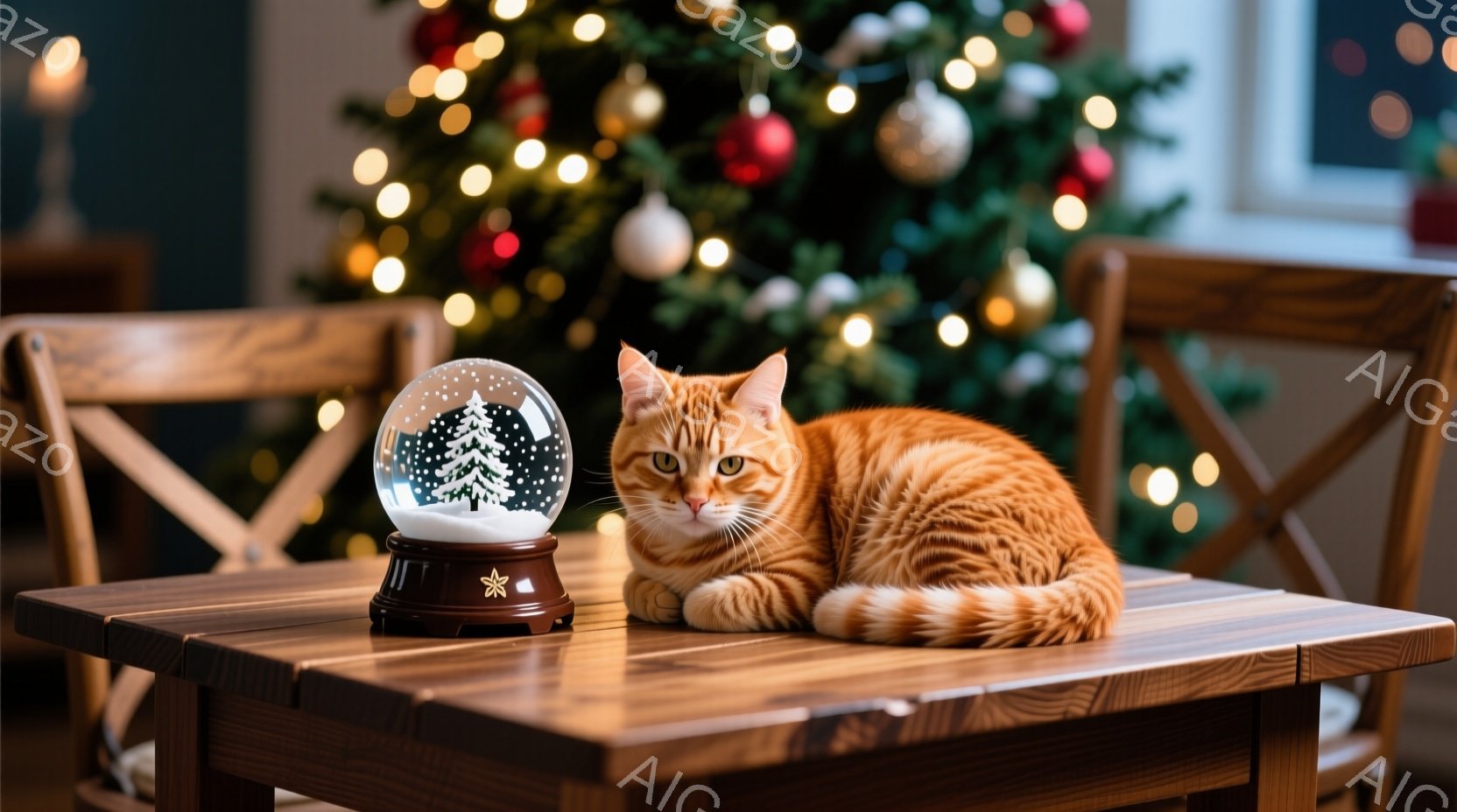 暖炉のある部屋の木製のテーブルの上に、オレンジ色の毛並みの猫が横たわっています。猫はリラックスした様子で、雪の結晶が散りばめられたテーブルに体を預れ、その隣には雪の結晶と小さなクリスマスツリーが入ったガラスの球体があります。背景にはぼやけたクリスマスツリーの光が暖かく、ホリデーシーズンを思わせる穏やかな雰囲気です。