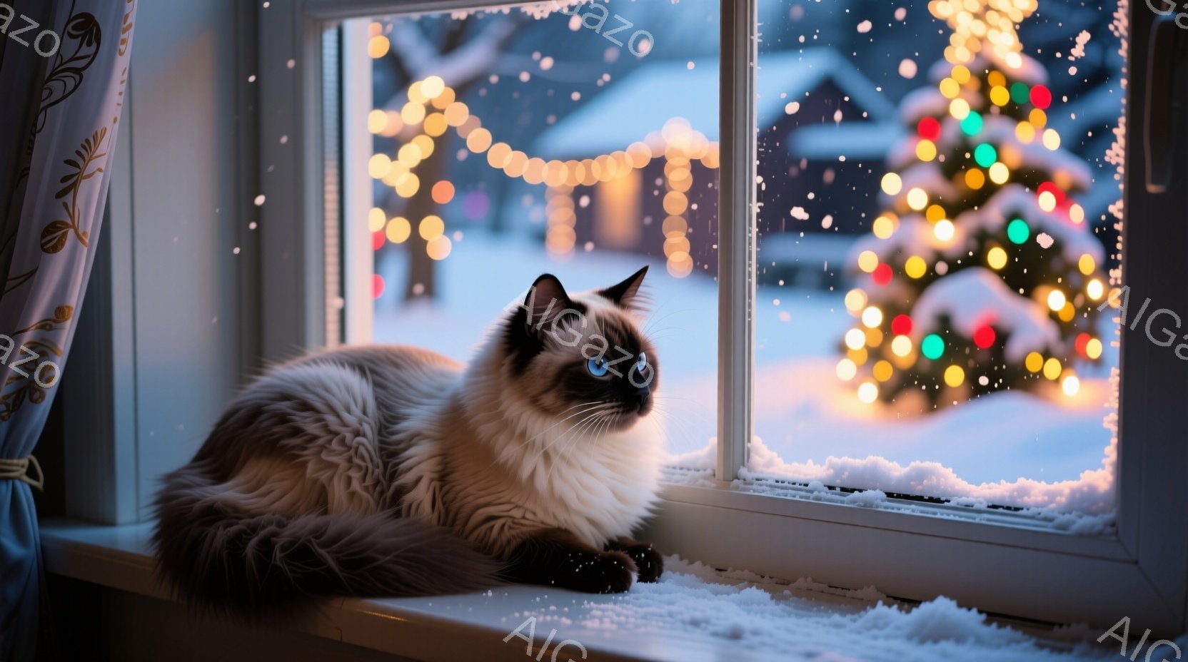 白い窓枠に座る、美しいシャム猫が目を惹く。外は雪景色で、遠くにクリスマスツリーが灯り、温かい光が雪に反射している。猫はリラックスした姿勢で、雪の降る冬の暖かな雰囲気を醸し出している。