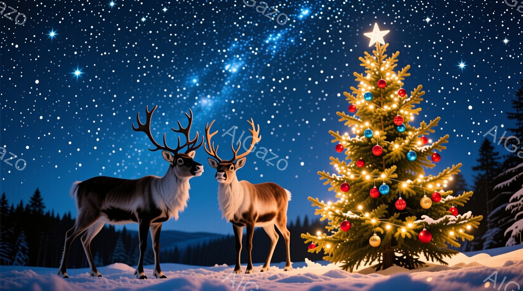 夜空の下、二頭のトナカイがクリスマスツリーの前に立っている。ツリーは色とりどりのオーナメントと光で飾られ、周囲は暗い森と短い草で覆われている。空には星が輝き、全体的に幻想的で温かいクリスマスの雰囲気が漂っている。