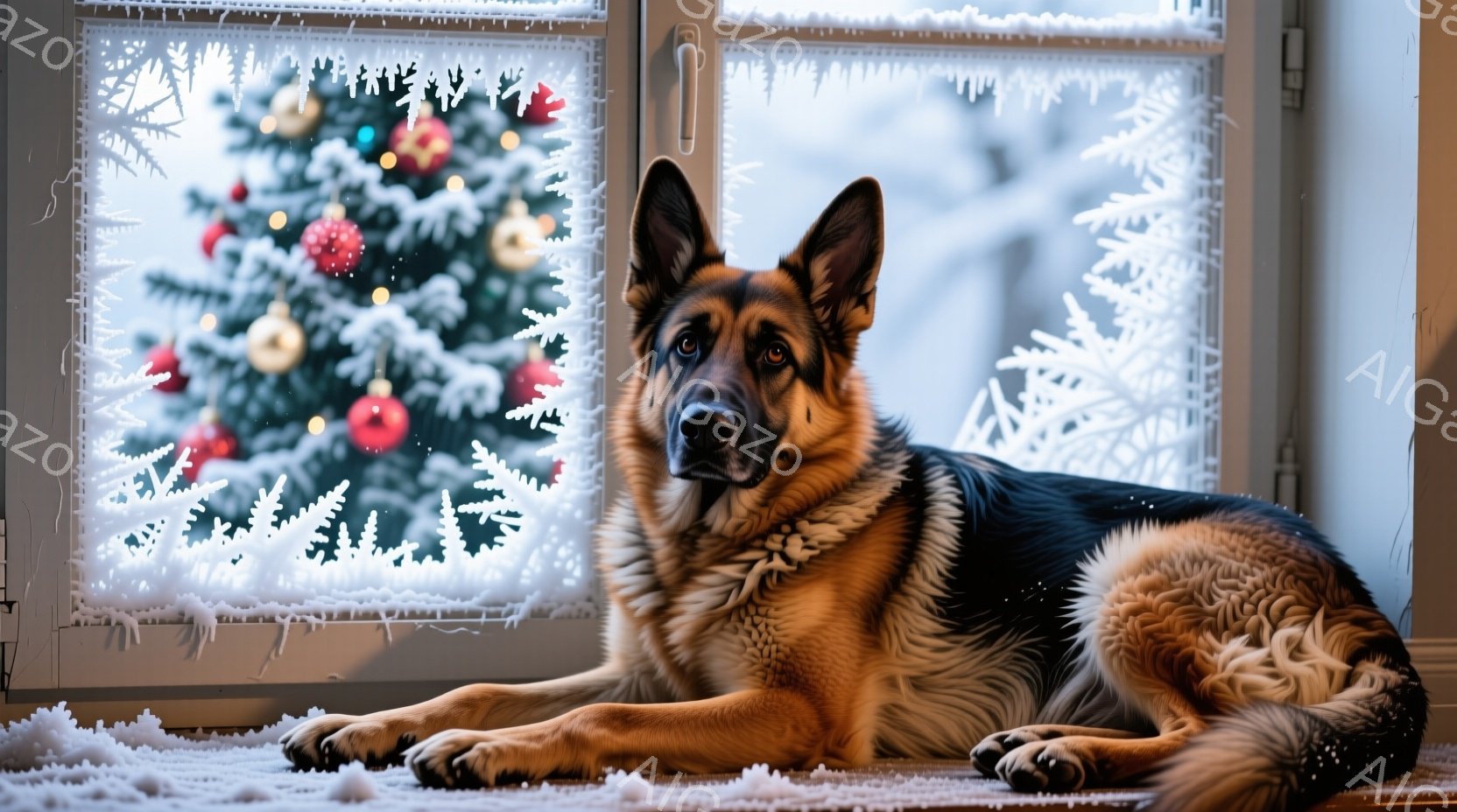 ドイツシェパード犬が白い敷物の上に横たわっています。窓の外には雪景色が見え、窓枠には雪の結晶の装飾が施されています。背景にはクリスマスツリーが飾られており、赤いオーナメントと電飾が暖かく輝き、クリスマスの雰囲気を感じさせます。