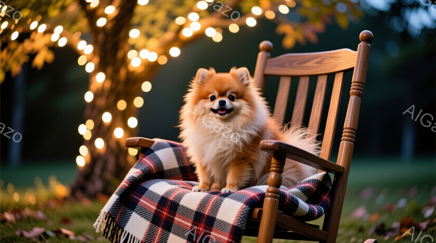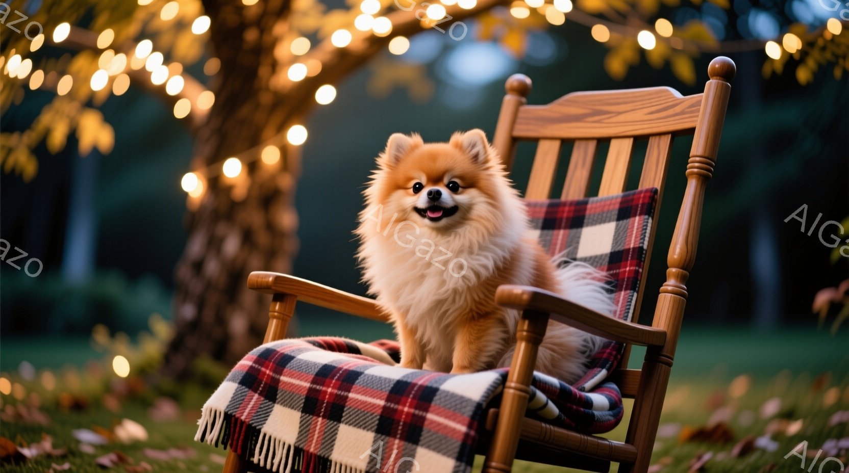 明るい茶色の毛並みを持つ小型犬が、チェック柄のブランケットがかけられたロッキングチェアに座っています。犬は正面を向き、笑顔でカメラを見つめており、リラックスした様子が伺えます。背景には木々が生い茂り、暖かい光のイルミネーションが飾られており、穏やかで心地よい雰囲気です。