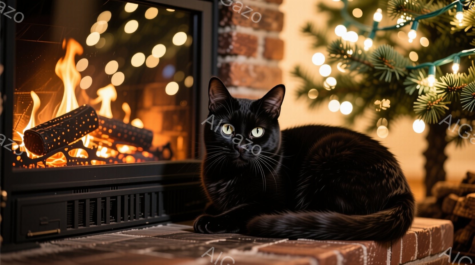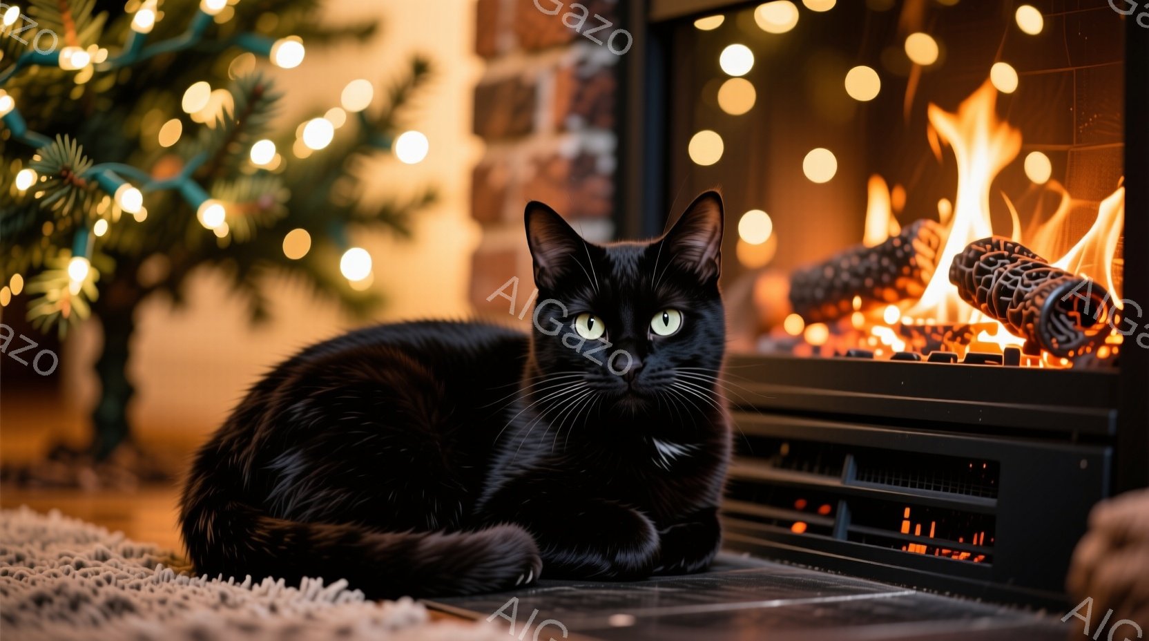 黒い猫が暖炉の前の敷居に丸まって座っています。猫の緑色の瞳が光っており、リラックスした表情で、背景にはぼんやりとしたクリスマスツリーの明かりが見えます。暖炉の火は赤とオレンジ色で燃え盛り、暖かく居心地の良い雰囲気を醸し出しています。