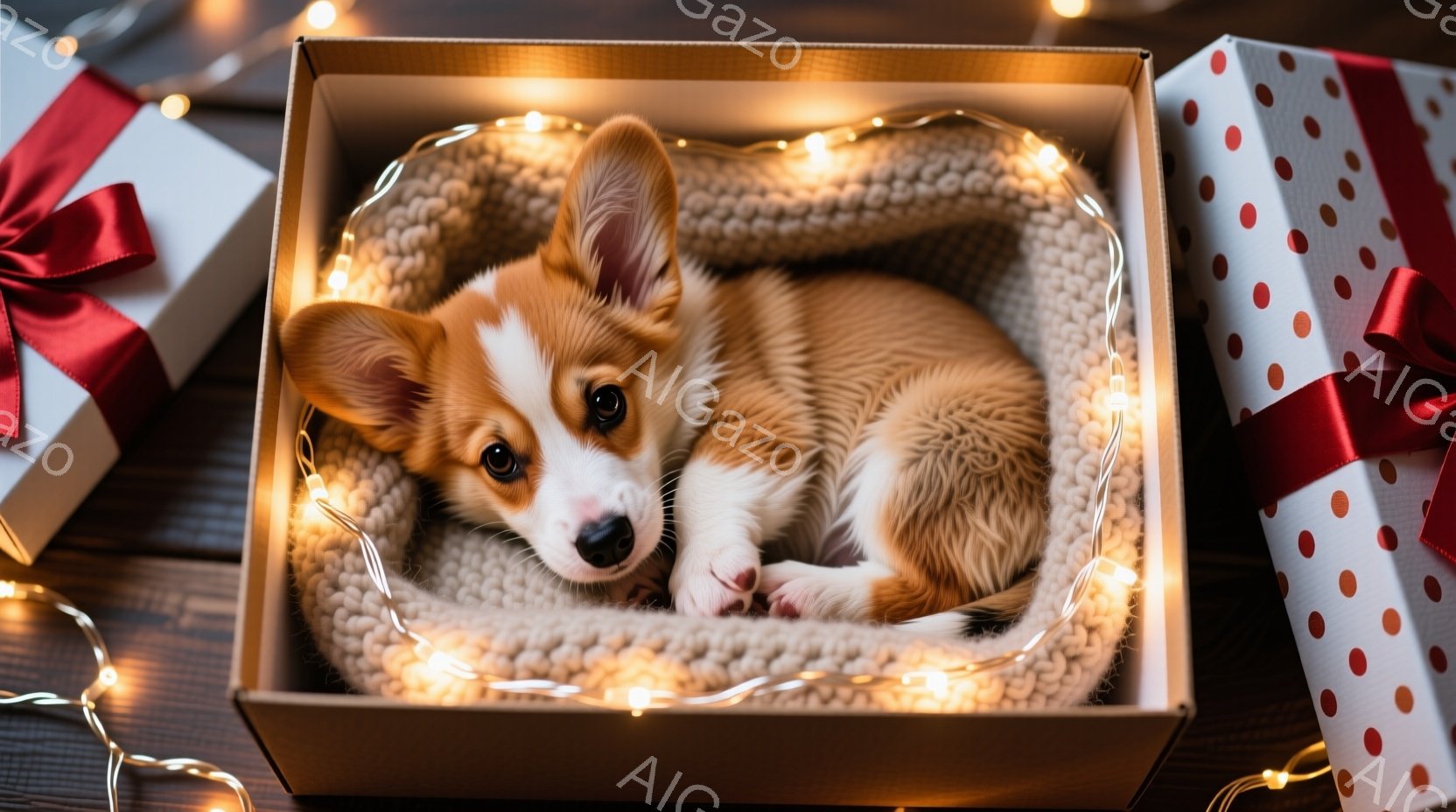 小さなコーギー犬が、編み物のベッドのようなものの中に丸まって眠っています。背景にはプレゼントボックスと、ぼんやりと光るクリスマスツリーのライトが見え、暖かく、お祝いムードに満ちています。犬はリラックスした表情で、冬のホリデーシーズンにぴったりの、心安らぐ情景です。