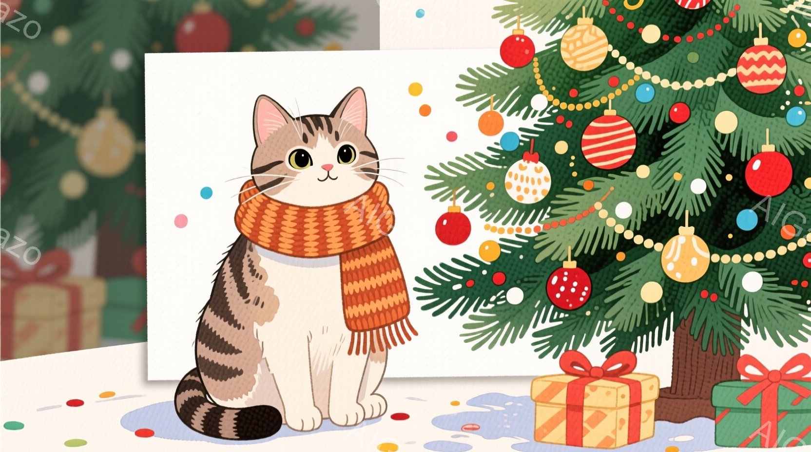 この無料AI生成画像「白とグレーの縞模様の猫が赤いマフラーを巻いて座っており、少し微笑んでいるように見えます。背景には、様々な色のオーナメントで飾られたクリスマスツリーがあり、下には雪が積もっています。全体的に、温かく、お祝いの雰囲気が漂う、可愛らしいイラストです。」は、2025年10月22日に作成されました。 サイズは 1664×928px の高解像度で、商用利用も可能なフリー素材として提供しています。