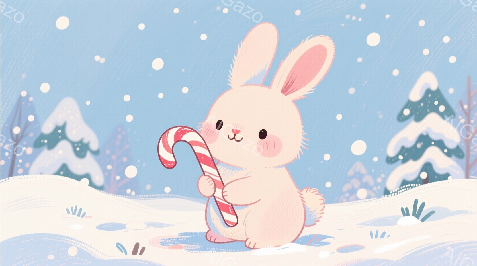 白い毛並みのウサギが、赤と白のキャンディケーンを抱えています。背景には雪景色が広がり、針葉樹の木々が点在し、雪が舞っている様子が描かれています。全体的に冬の暖かく穏やかな雰囲気が漂っています。