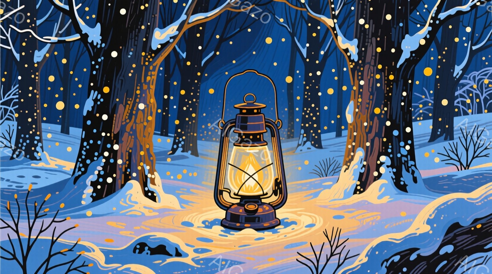 雪が降り積もる森の中で、暖かく光るランタンが置かれている風景です。周りには雪に覆われた低木や草が生え、背景にはうっそうと茂った木々がシルエットとなって描かれています。全体的に静かで幻想的な冬の雰囲気が漂っており、ランタンの光がその静寂を優しく照らしています。