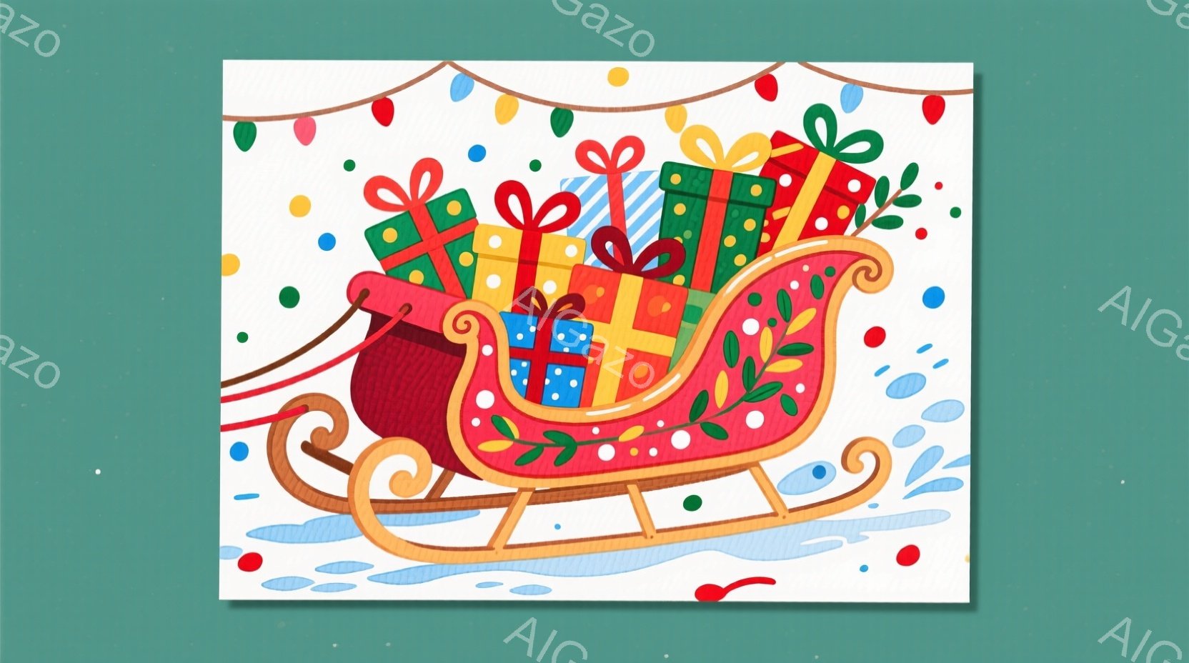 赤いそりはプレゼントの山でいっぱいになり、緑と金色のリボンで飾られています。背景には水色の雪の表現があり、赤、緑、黄色の小さな水玉模様が散りばめられています。全体として、暖かくお祝いの雰囲気で、クリスマスの喜びを象徴するイラストです。