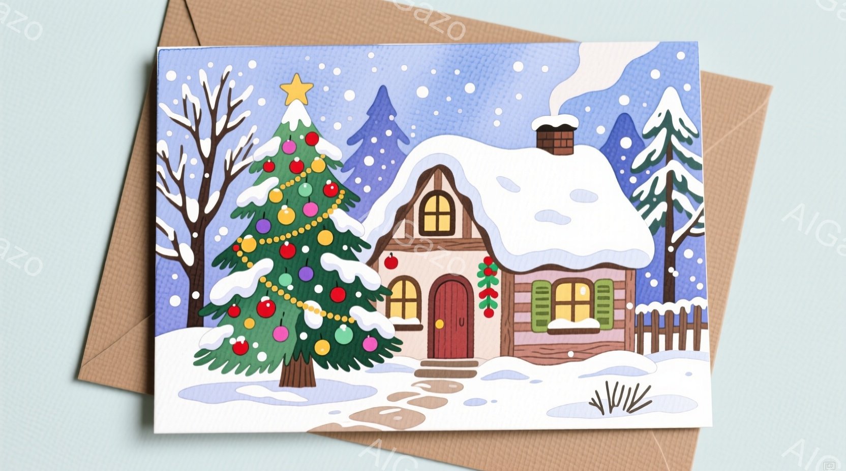雪が降り積もる冬の風景が描かれています。青い屋根の可愛らしい家と、色とりどりのオーナメントで飾られたクリスマスツリーが印象的です。遠くには雪に覆われた木々が見え、暖炉から立ち上る煙が家の中の暖かさを暗示しています。