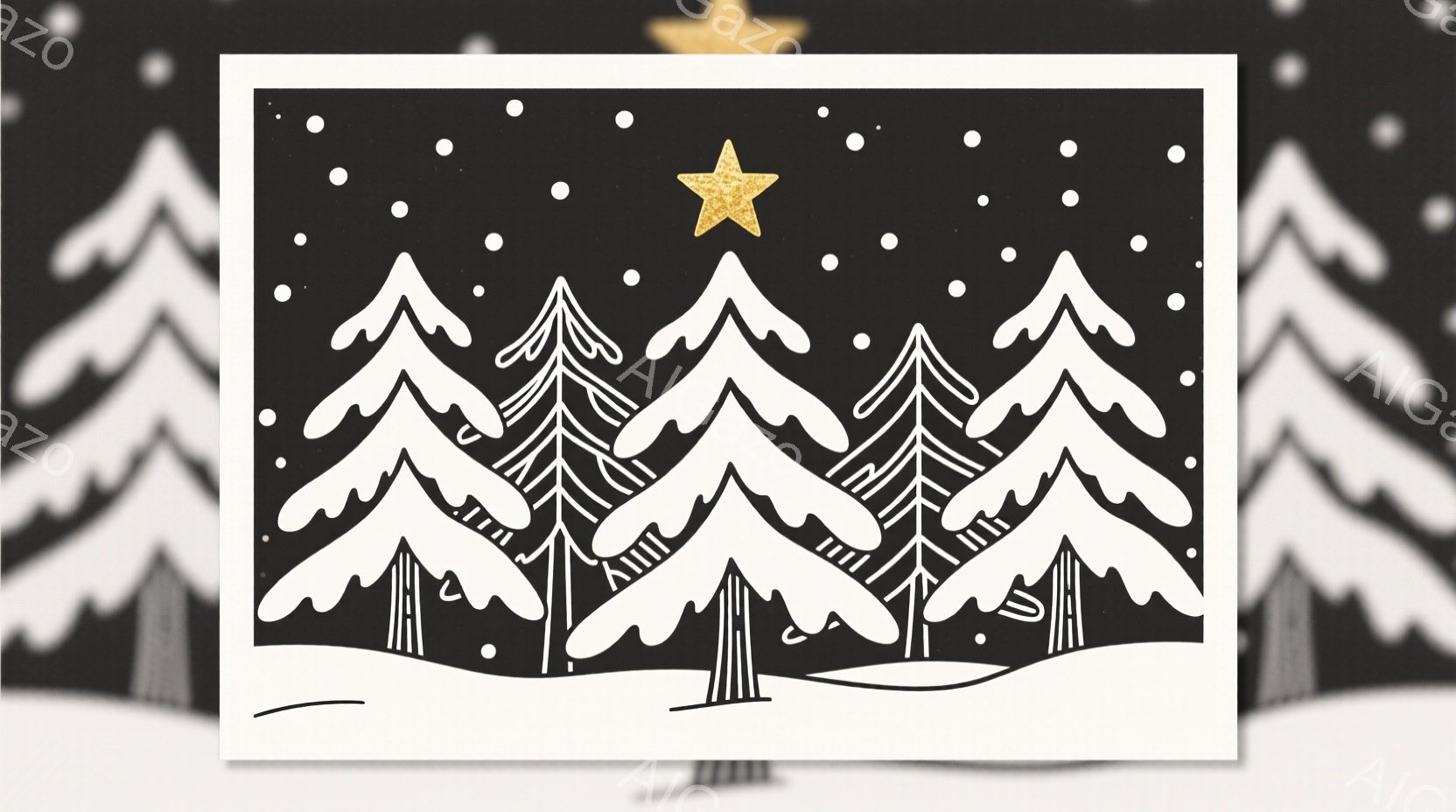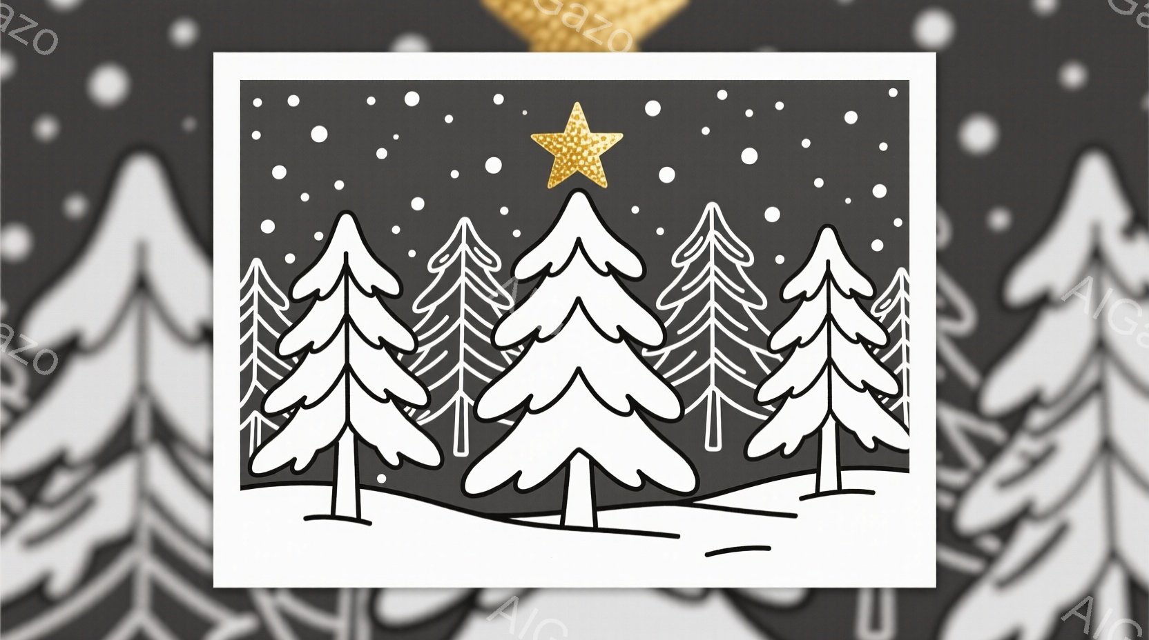 針葉樹のグループが雪景色の中に描かれており、一番中央の木には星が輝いています。雪は細かく、背景全体を覆っており、冬の静けさと安らぎの雰囲気を醸し出しています。シンプルな線画で描かれ、モノクロームと星のゴールドが印象的です。