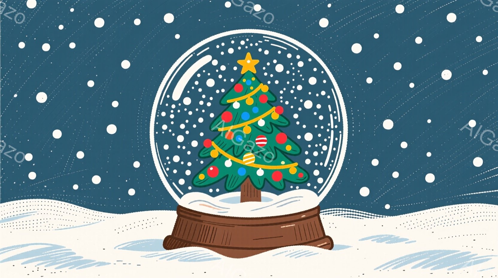 雪が降る背景に、雪の上に置かれたクリスマスの置物が見えます。置物は、赤い台座の上に雪玉が乗っており、その中にクリスマスツリーが飾られています。ツリーは緑色で、赤い飾りや金色の星で装飾されており、暖かくお祝いの雰囲気です。