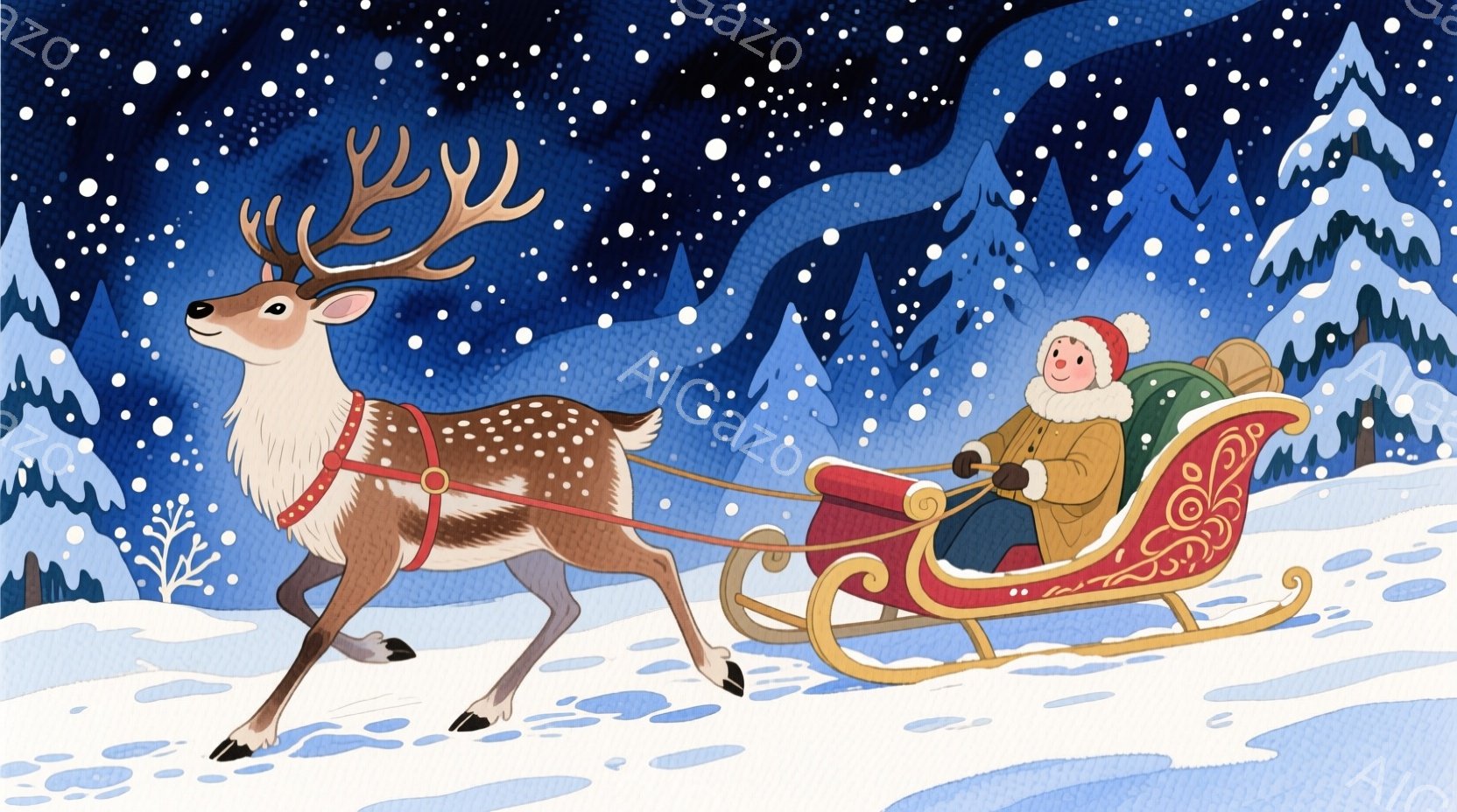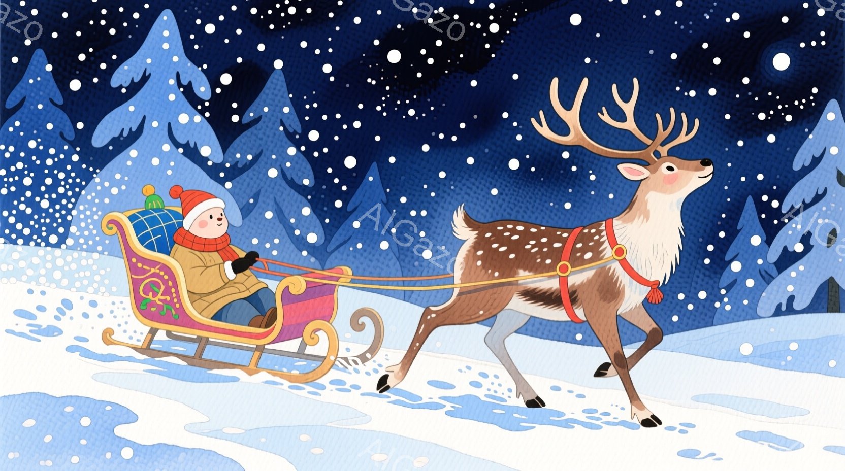 雪の降る夜、そりはトナカイに引かれて雪の上を疾走している。運転している少年は赤い帽子とコートを着ており、笑顔で前を見ている。背景には、暗い緑色の針葉樹林と、遠くに見える三日月が描かれており、幻想的で温かい雰囲気を醸し出している。