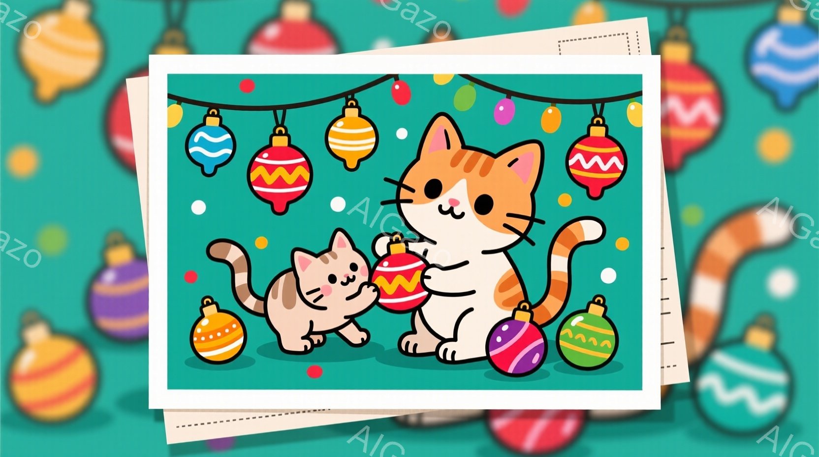 この無料AI生成画像「オレンジ色の縞模様の猫が赤いオーナメントボールを抱えています。猫は口を開けて微笑んでおり、陽気な表情をしています。背景には、様々な色のクリスマスオーナメントや装飾が散りばめられており、全体的に明るくお祝いの雰囲気です。」は、2025年10月22日に作成されました。 サイズは 1664×928px の高解像度で、商用利用も可能なフリー素材として提供しています。