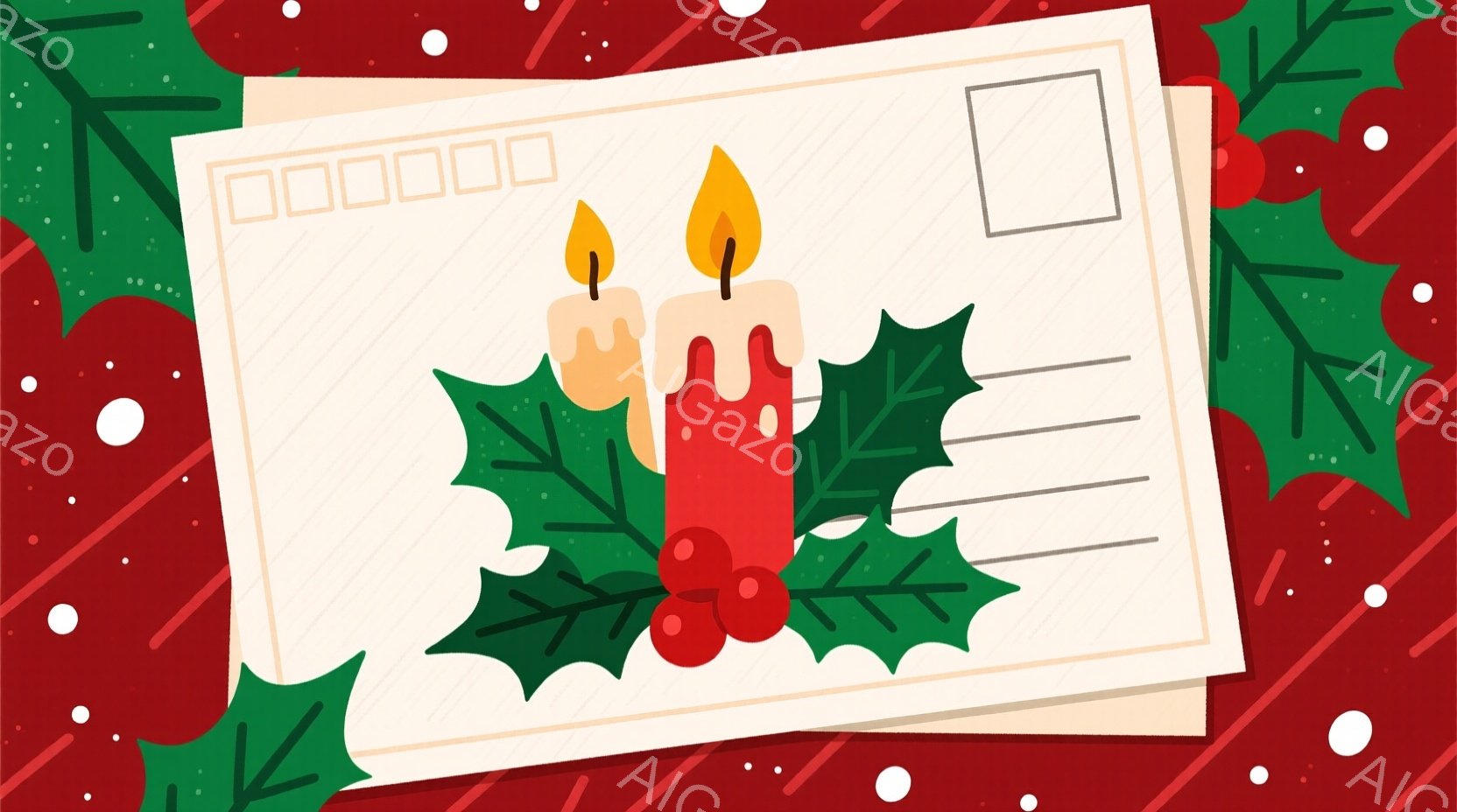明るい緑色の背景に、キャンドルと冬の葉が描かれたグリーティングカードが重ねてあります。キャンドルは3本あり、暖かく穏やかな光を放っています。背景には赤いストライプ模様と冬の葉のパターンがあり、全体的に温かく、お祝いの雰囲気を醸し出しています。
