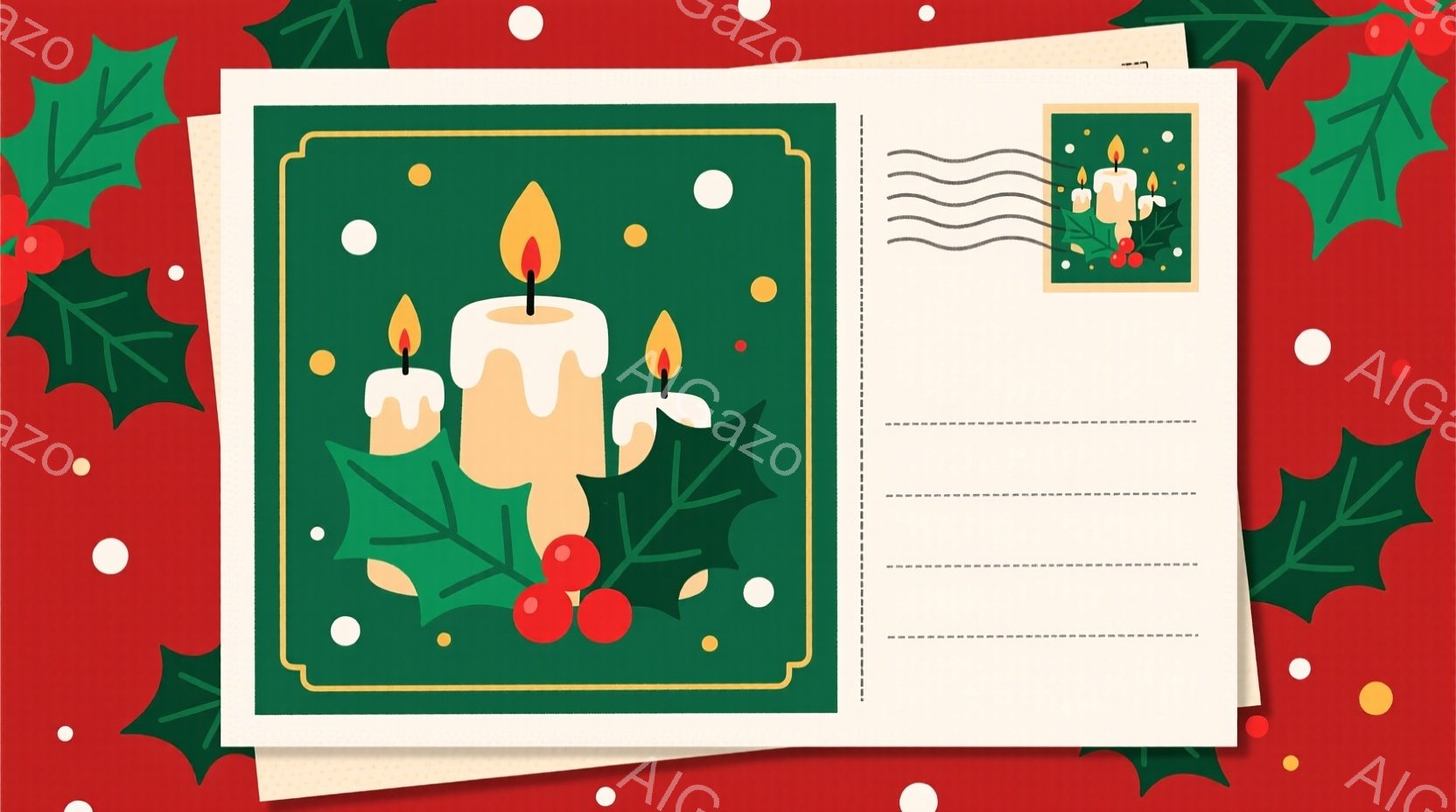 この無料AI生成画像「明るい緑色の背景に、キャンドルと冬の葉が描かれたグリーティングカードが重ねてあります。キャンドルは3本あり、暖かく穏やかな光を放っています。背景には赤いストライプ模様と冬の葉のパターンがあり、全体的に温かく、お祝いの雰囲気を醸し出しています。」は、2025年10月22日に作成されました。 サイズは 1664×928px の高解像度で、商用利用も可能なフリー素材として提供しています。
