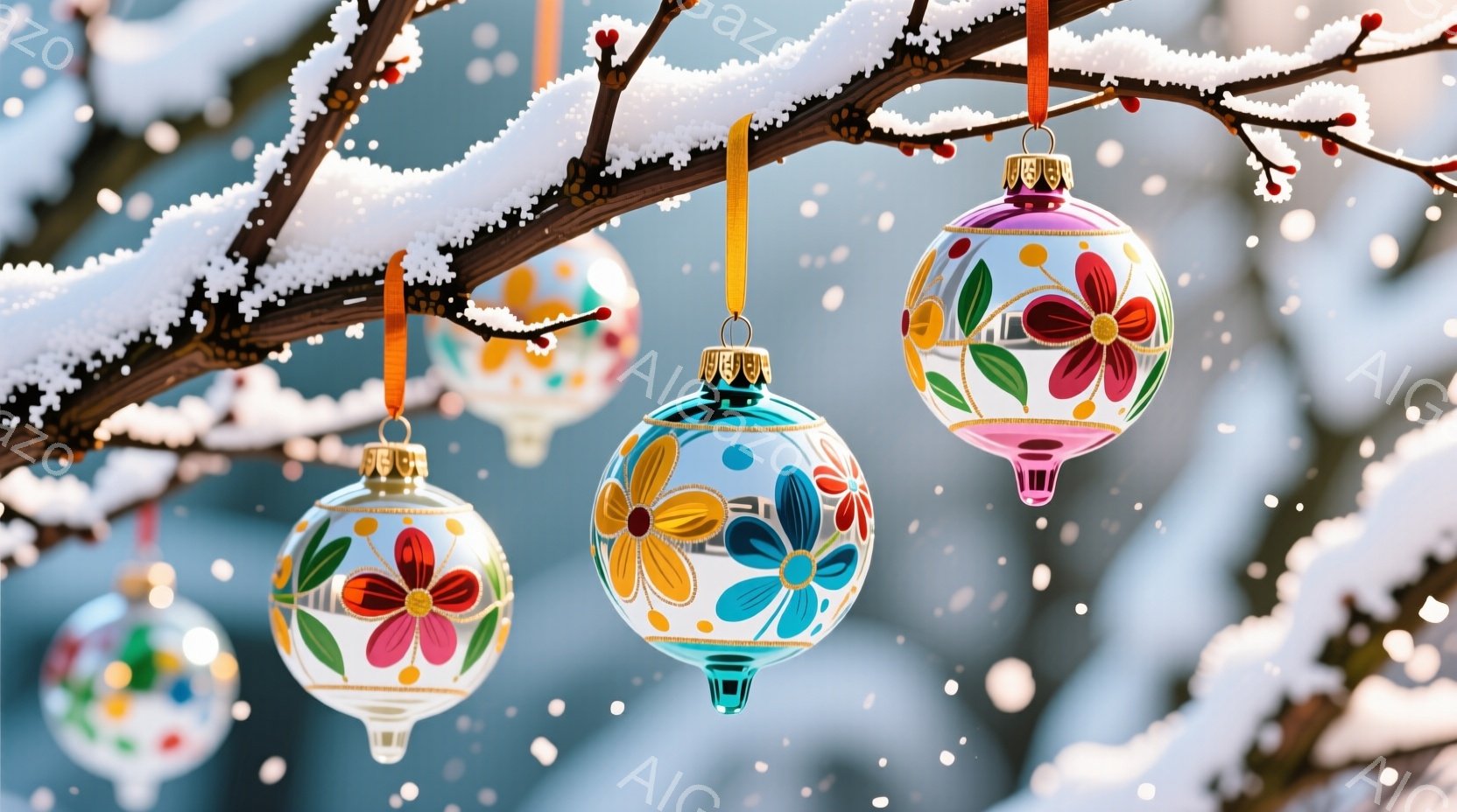 雪に覆われた木の枝に飾られた3つのクリスマスのオーナメントが写っています。それぞれが透明な球体で、鮮やかな色彩の花柄が描かれており、赤、黄色、そしてピンクの花が特徴的です。背景は雪景色で、オーナメントと雪のコントラストが冬の温かく幻想的な雰囲気を醸し出しています。