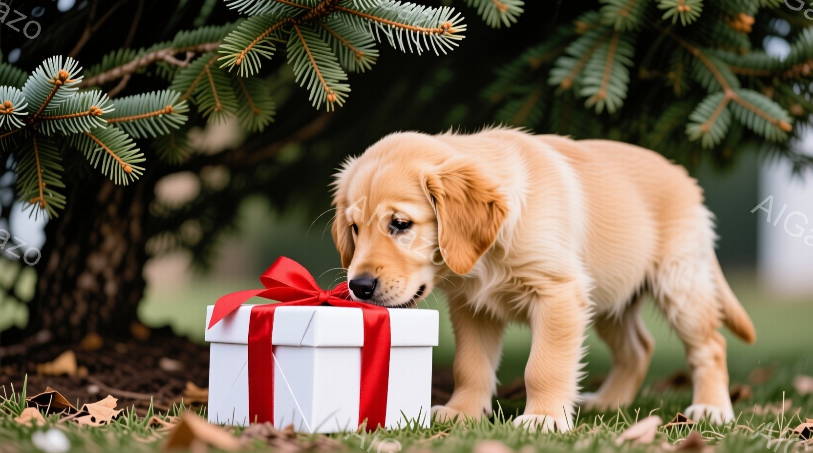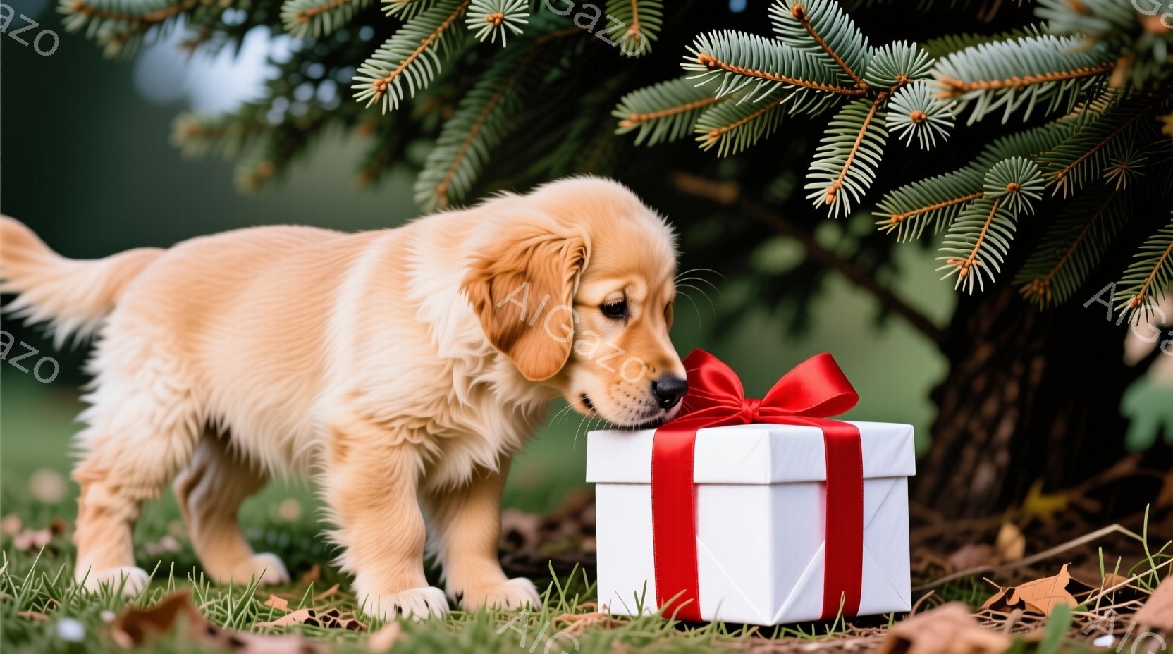 黄金色の毛並みのゴールデンレトリバーの子犬が、赤いリボンで結ばれた白いプレゼントボックスの前に佇んでいます。子犬は鼻をプレゼントに近づけ、興味津々な表情を浮かべています。背景には、装飾されたクリスマスツリーと落ち葉が広がる自然があり、温かく、お祝いの雰囲気を醸し出しています。