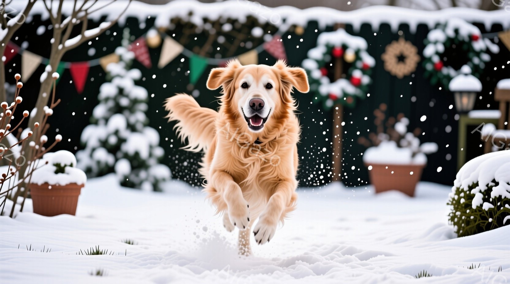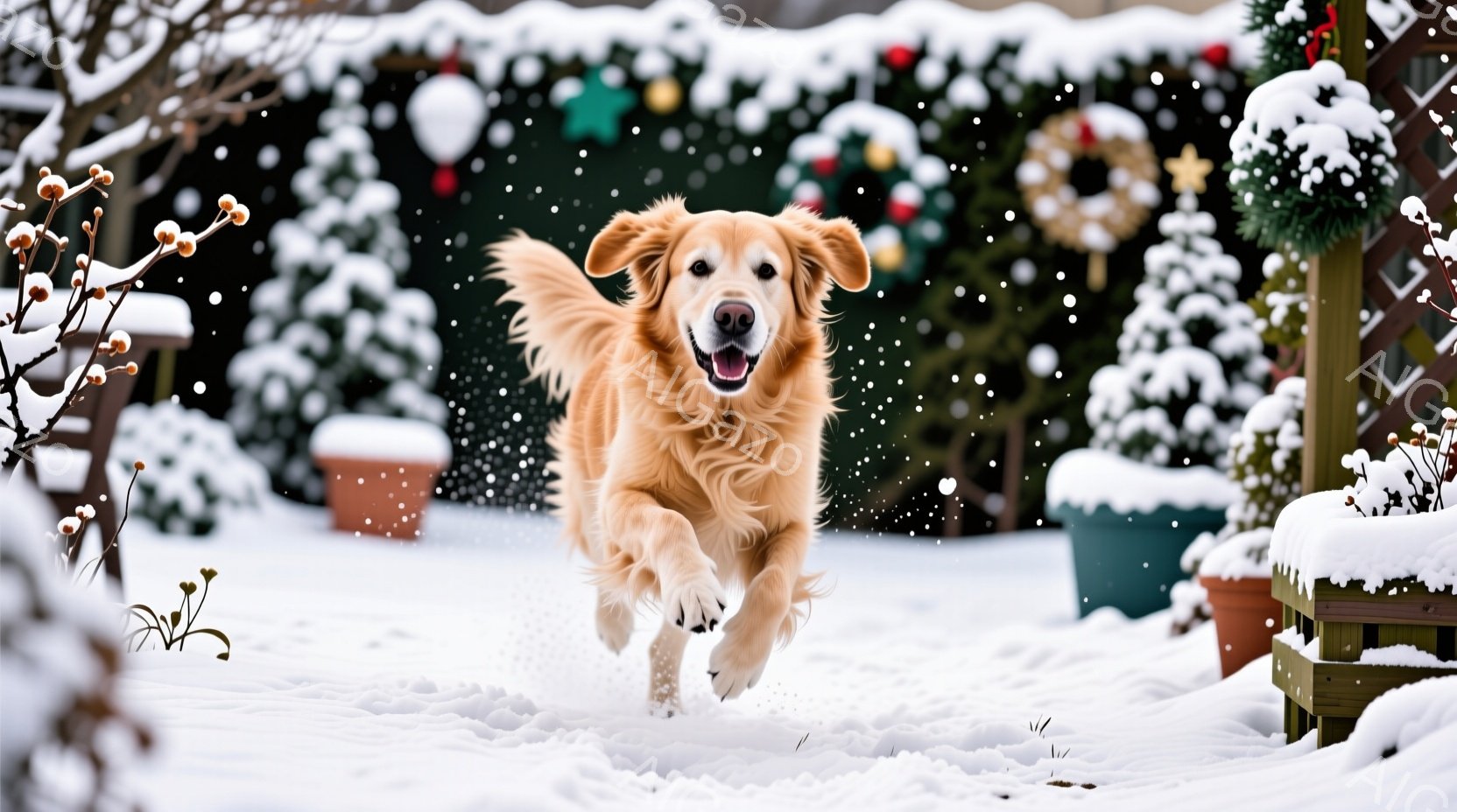 雪が降る庭で、ゴールデンレトリバーが勢いよく走っている。背景には、クリスマス飾りが施されたフェンスと、雪で覆われた植木鉢が並び、冬の温かく楽しい雰囲気が漂っている。犬は口を開けて笑顔で走り、その活発な姿が雪景色の中で際立っている。