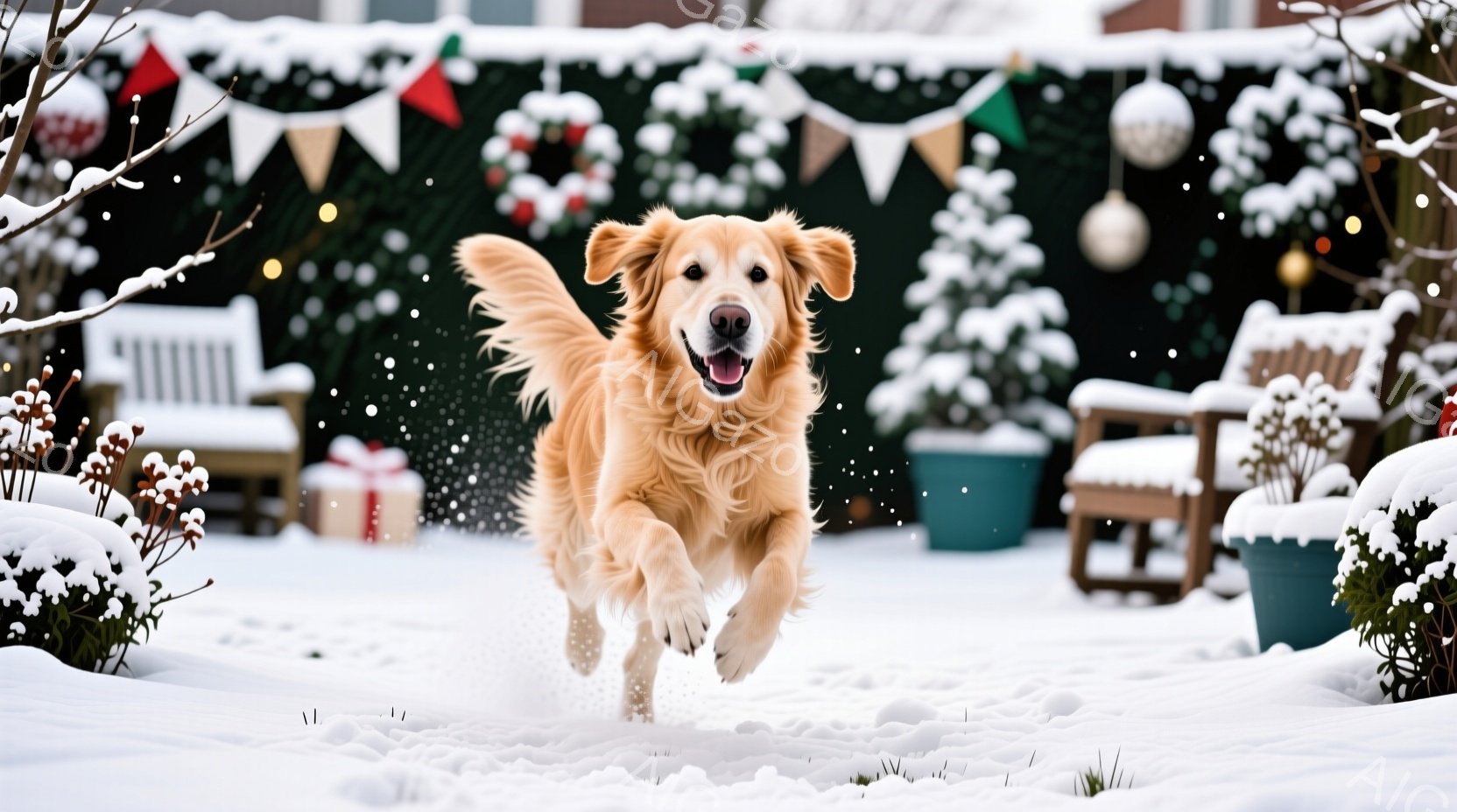 雪が降る庭で、金色のレトリバーが雪の中を走り、楽しそうに口を開けている。背景には、雪で覆われた木々や装飾が施された鉢植えがあり、クリスマスの飾り付けが施されたフェンスが見える。全体的に、明るく、楽しく、冬の喜びを感じさせる雰囲気である。