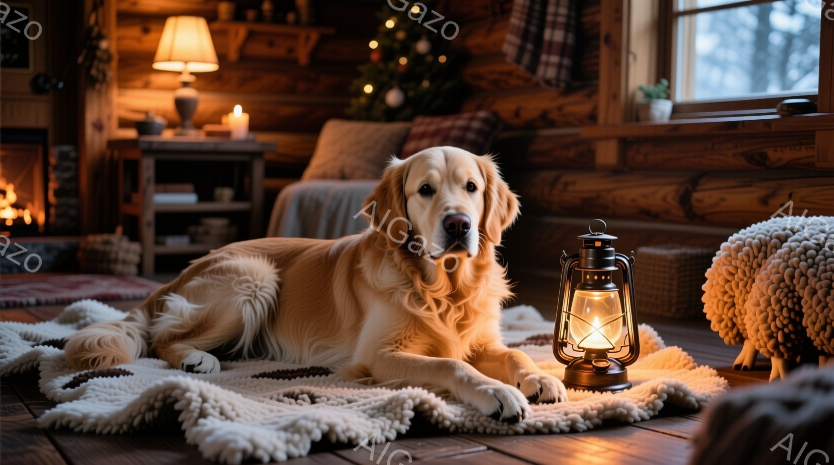 暖炉のある木造コテージの床に、ゴールデンレトリバーがリラックスして横たわっています。そばには、柔らかい毛並みの白い羊のぬいぐるみと、点灯したオイルランプが置かれています。暖炉の火とランプの光が、部屋全体を温かく照らし、穏やかで心地よい雰囲気を醸し出しています。