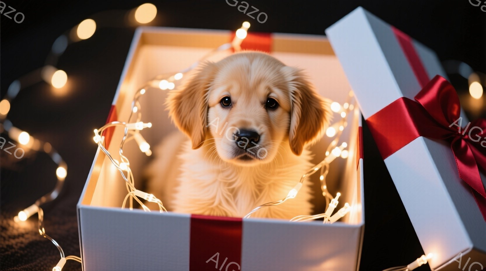 金色のパピーが、水色のドット模様のギフトボックスの中に座っています。周りには温かい光を放つクリスマスライトが巻き付けられ、箱の隣には赤いリボンがついた別のギフトボックスがあります。全体的に暖かく、お祝いムードにあふれた、可愛らしい光景です。