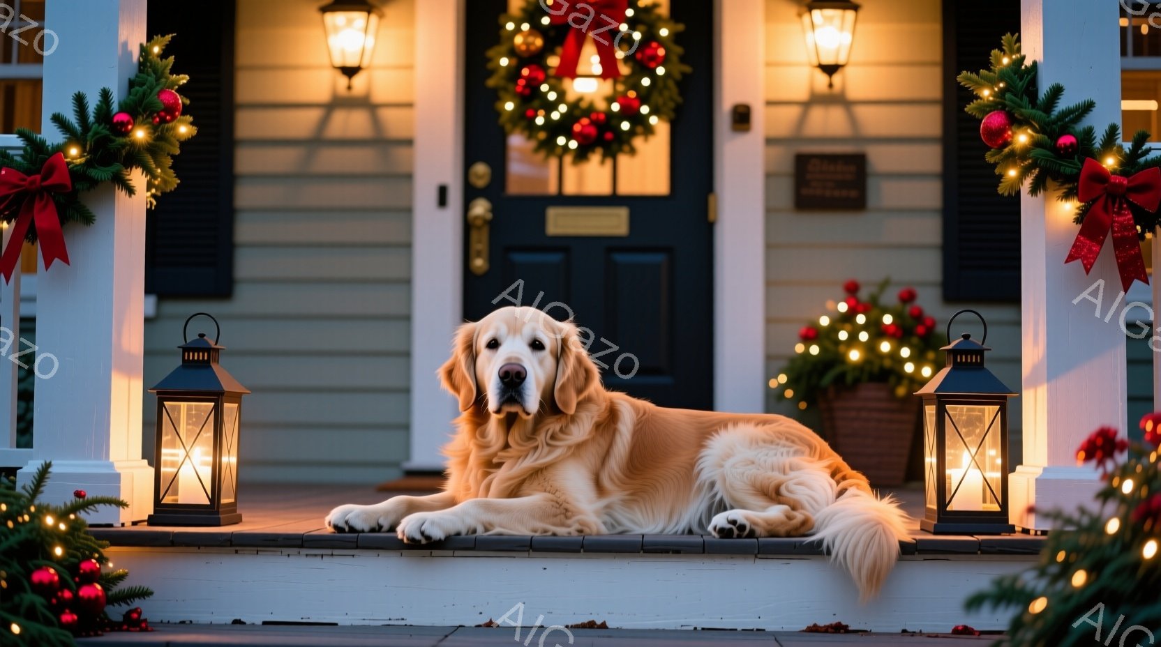 白い柵に沿ってクリスマスの装飾が施された玄関先に、ゴールデンレトリバーが横たわっています。犬はリラックスした表情で、明るい光が灯るランタンと、赤い実の付いたクリスマスのリース、そして装飾された植物に囲まれています。全体的に温かく、穏やかなクリスマスの雰囲気が漂っています。