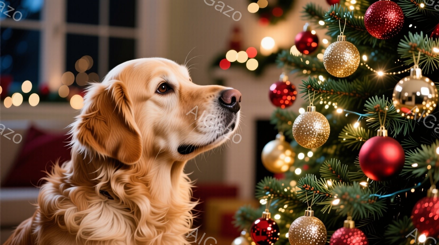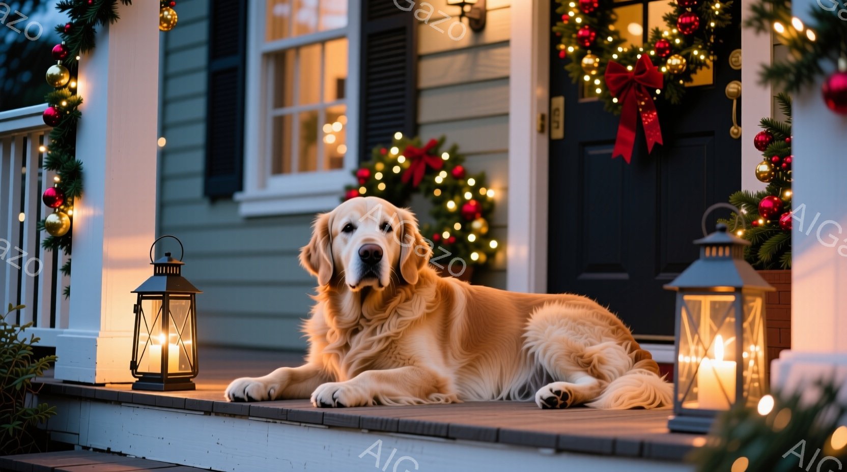黄金色のレトリバー犬が、クリスマスの飾り付けがされた玄関の段差に横たわっています。背景には、クリスマスリース、キャンドルが灯されたランタン、そして赤い実がつけた植物が見え、温かみのあるクリスマスの雰囲気を醸し出しています。犬はリラックスした様子で、穏やかで平和な光景です。