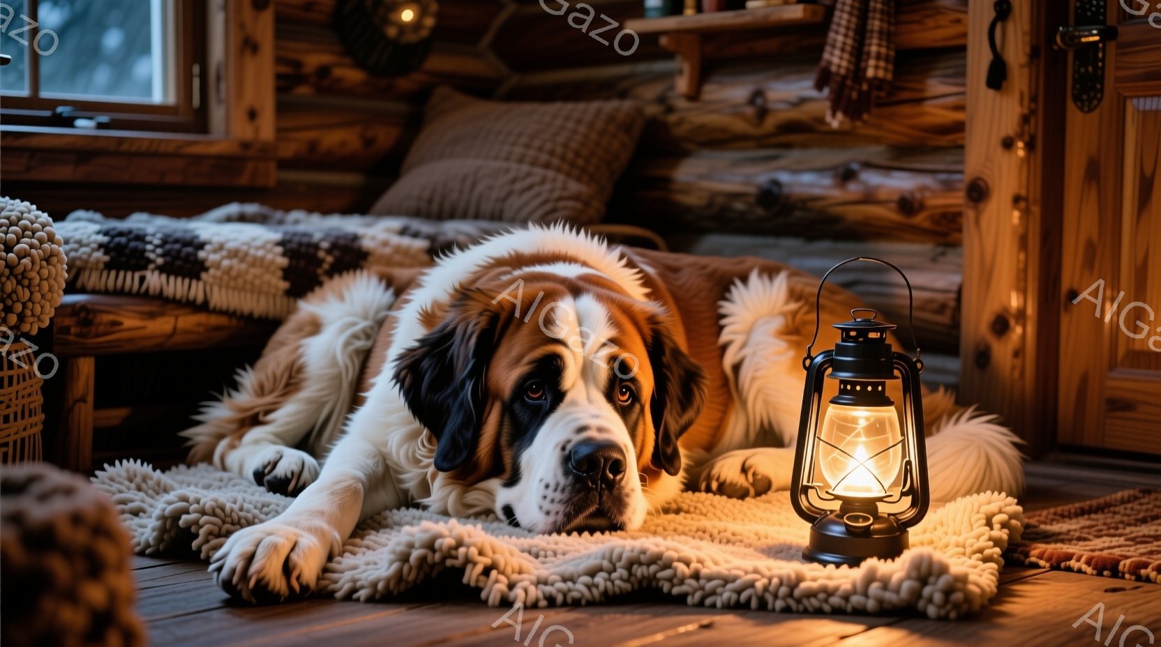 大きなセント・バーナード犬が、木の床に敷かれた厚い編み物の敷物の上で横たわっています。背後にはログハウスの壁と、チェック柄のクッションが置かれた木製のベンチが見え、暖炉の温かい光と、外の雪景色が窓から差し込んでいます。ランプの柔らかな光が犬の顔を照らし、リラックスした、穏やかな雰囲気を醸し出しています。