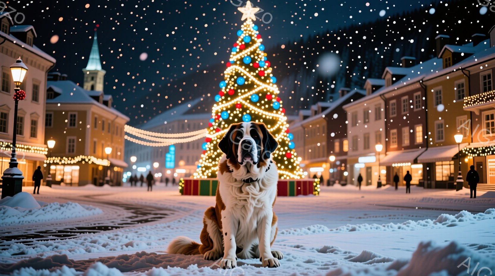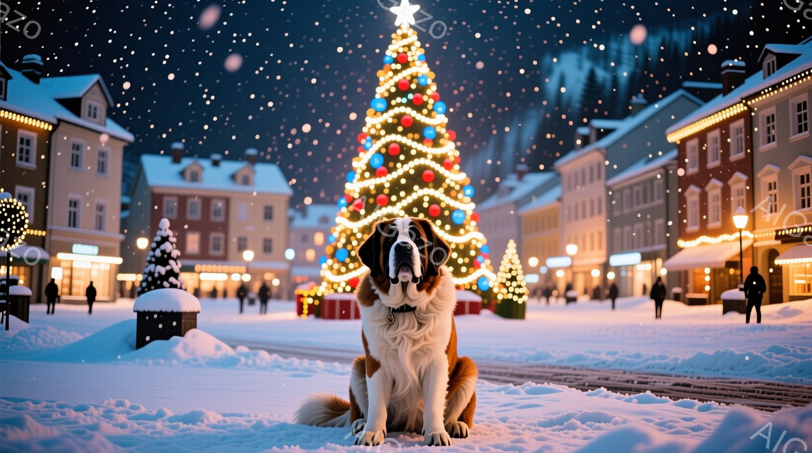 雪が舞う夜の広場に、セントバーナード犬が座っています。犬は穏やかな表情で正面を見つめ、ふさふさとした毛並みが特徴的です。背景には、クリスマスツリーやイルミネーションで飾られた建物が並び、冬の暖かい雰囲気を醸し出しています。