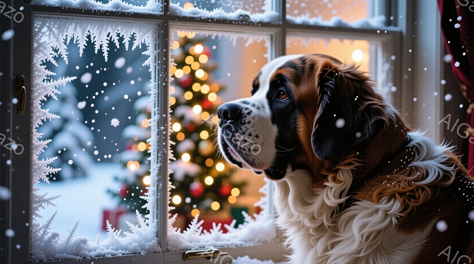 窓辺に座ったセント・バーナード犬が、雪景色を眺めています。その表情は穏やかで、少し物憂げな様子も伺えます。背景にはクリスマスツリーが飾られ、暖かく幻想的な雰囲気を醸し出しています。