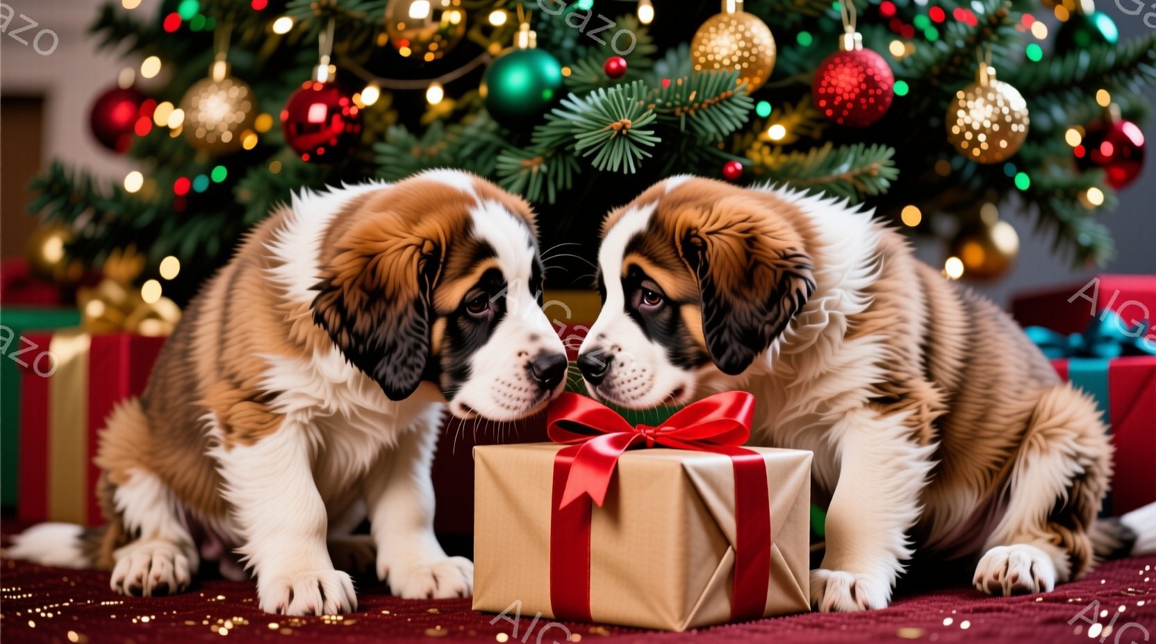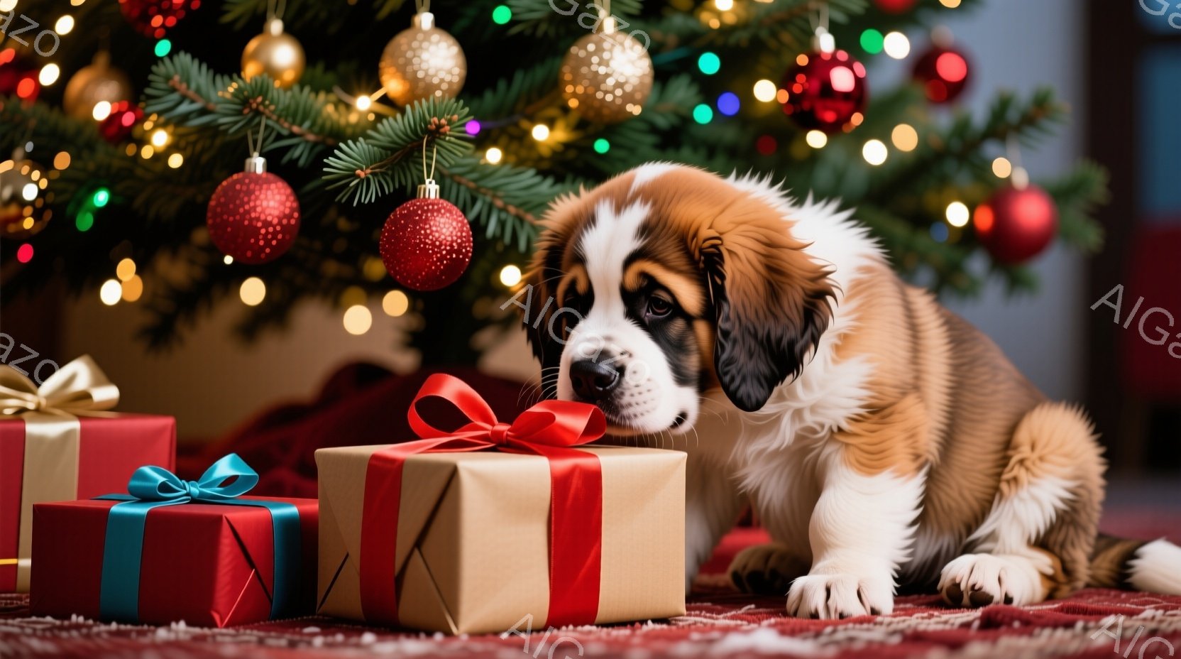 クリスマスツリーの足元に、ラッピングされたプレゼントがいくつか置かれています。ふわふわの毛並みを持つセントバーナードの子犬が、プレゼントの横に座り、興味深そうにプレゼントを見つめています。背景にはキラキラと輝くクリスマスツリーの飾りがあり、暖かく幸せなクリスマスの雰囲気が漂っています。