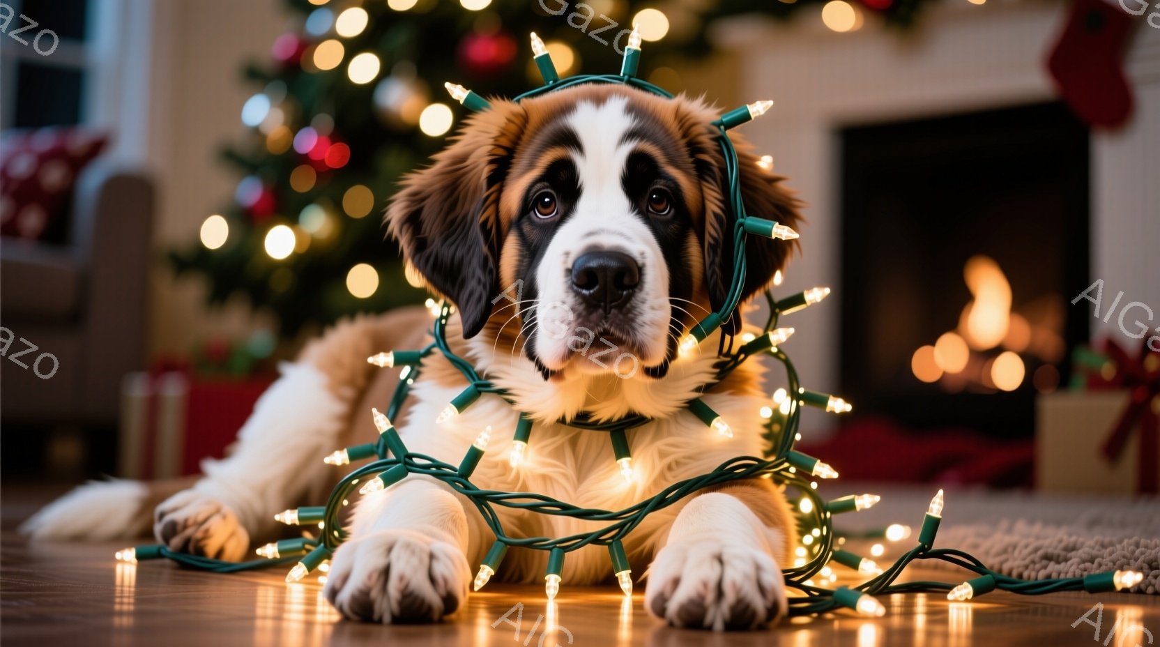 白と茶色のセント・バーナード犬が床に横たわり、クリスマスツリー用の電飾に覆われています。犬は前足を伸ばし、穏やかな表情でカメラを見つめており、リラックスした様子が伺えます。背景には、ぼやけたクリスマスツリーとプレゼントが配置され、暖かくお祝いムードの室内が広がっています。
