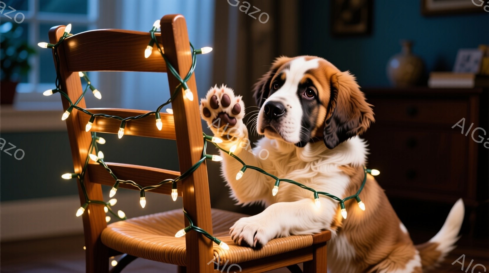 暖炉のある室内で、毛むくじゃらの子犬が椅子に座り、片足を上げています。椅子にはオレンジ色のイルミネーションライトが巻き付けられ、暖かく、お祝いの雰囲気を醸し出しています。背景は少しぼやけており、落ち着いた照明が子犬の愛らしい姿を際立たせています。