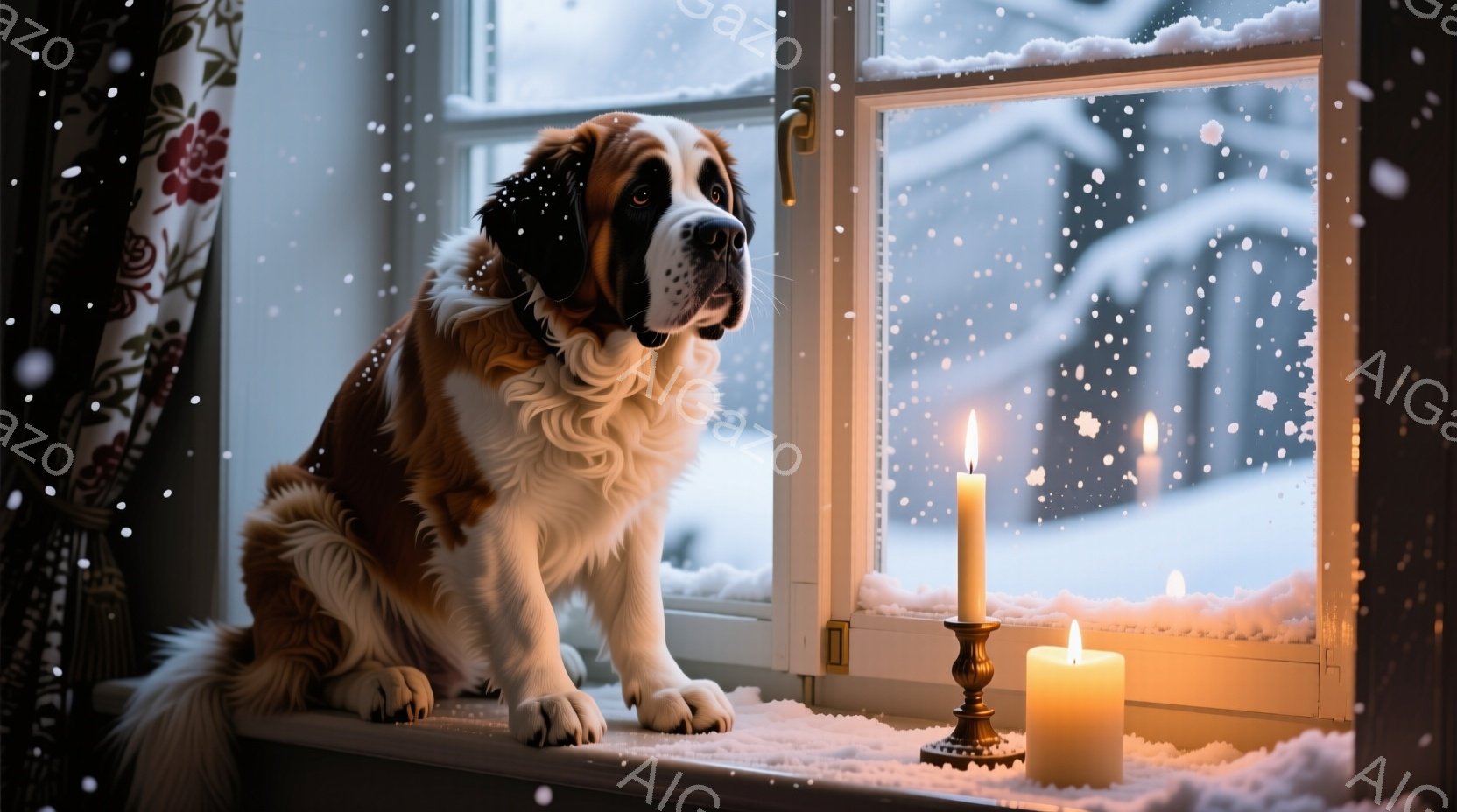 白い窓枠に座る大きなセント・バーナード犬が描かれています。外は雪が降り積もり、窓の外には白い景色が広がっています。窓辺には点灯したキャンドルが置かれ、暖かく穏やかな雰囲気を醸し出しています。